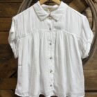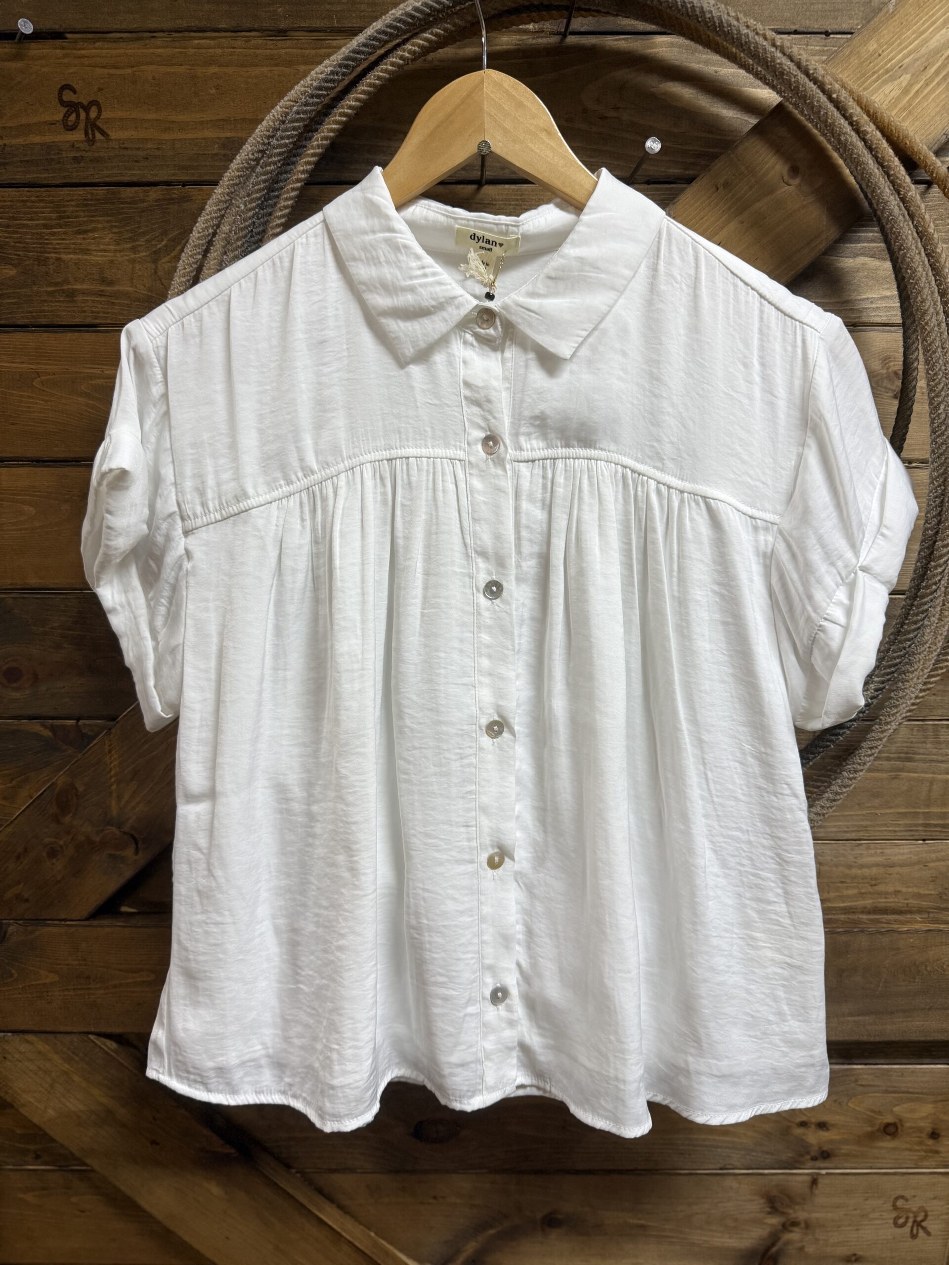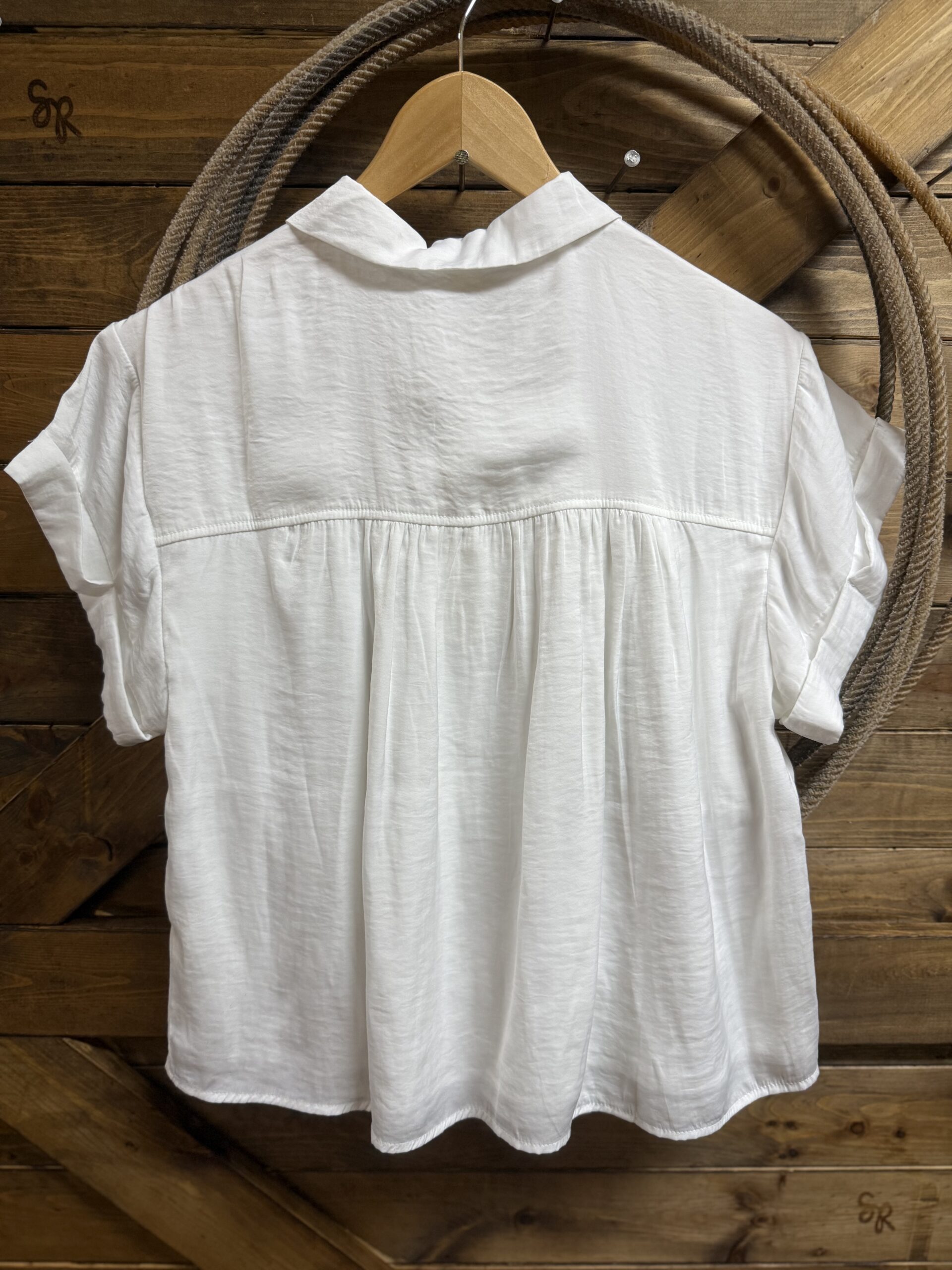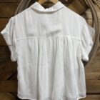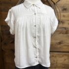Every girl should have a plain white blouse! It’s far from basic but serves a basic need! Dressy but simple, the front is pulled across the chest and lined with the prettiest little shiny buttons. A traditional collar lays over and the sleeves simply cap the shoulder and cuff for a more elegant sleeve. The back has the same cute pull across the center to make for a little bit of a looser fit. This one goes everywhere with you for all of the reasons. Cute with denim shorts, dressy with a skirt, and the perfect business professional cap.