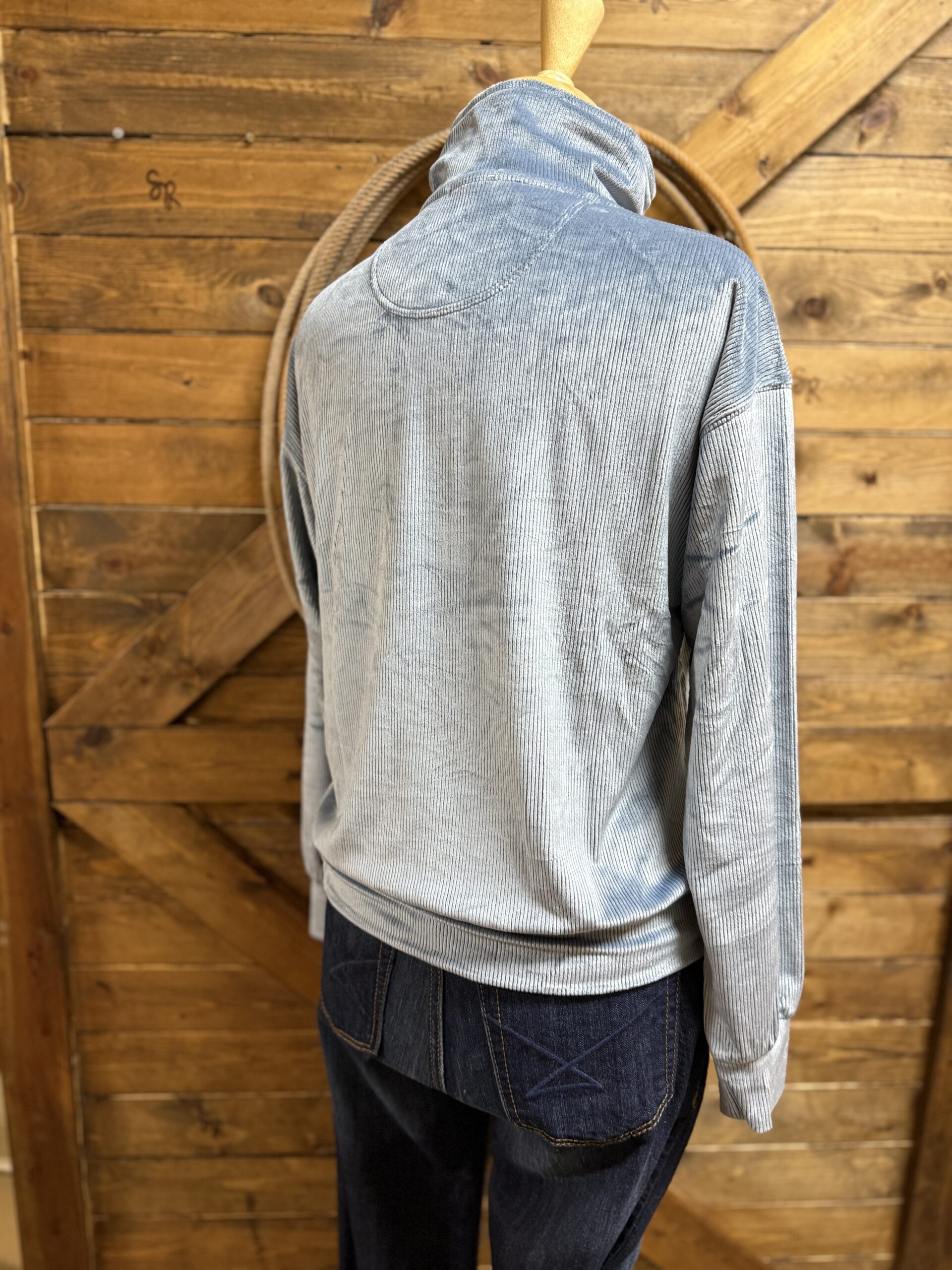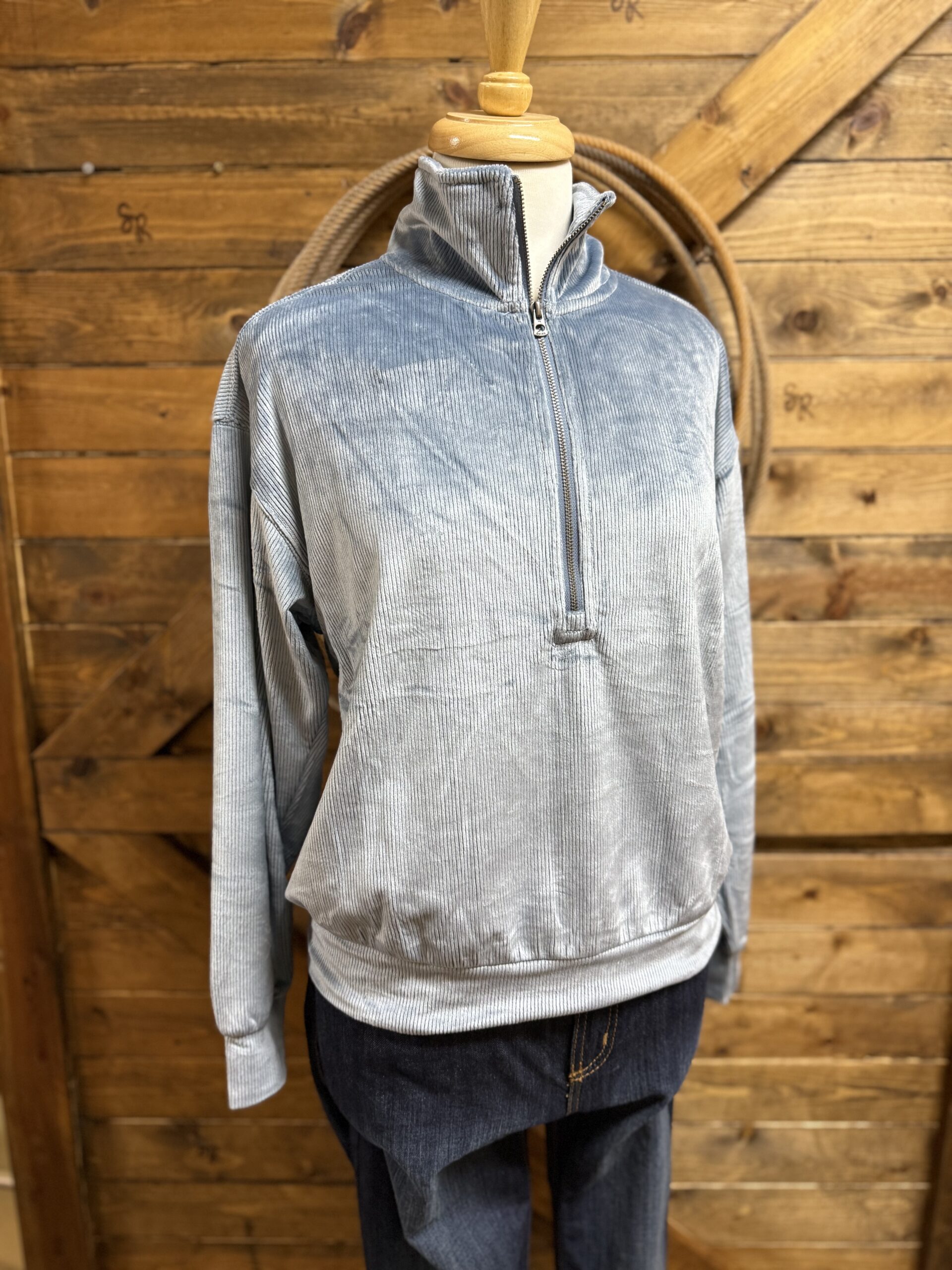 A pullover that is sure to become a favorite in your closet. The softest velvety corduroy pullover ever! Pretty light blue denim in color with a 1/4 zip coming off of the collar. The sleeves are slightly gathered at the cuff with a bit of stretch for a comfy fit around your wrist. I promise it will be the one you are always looking for! Go on and trust us when we say it will be a favorite!! You won’t be disappointed.