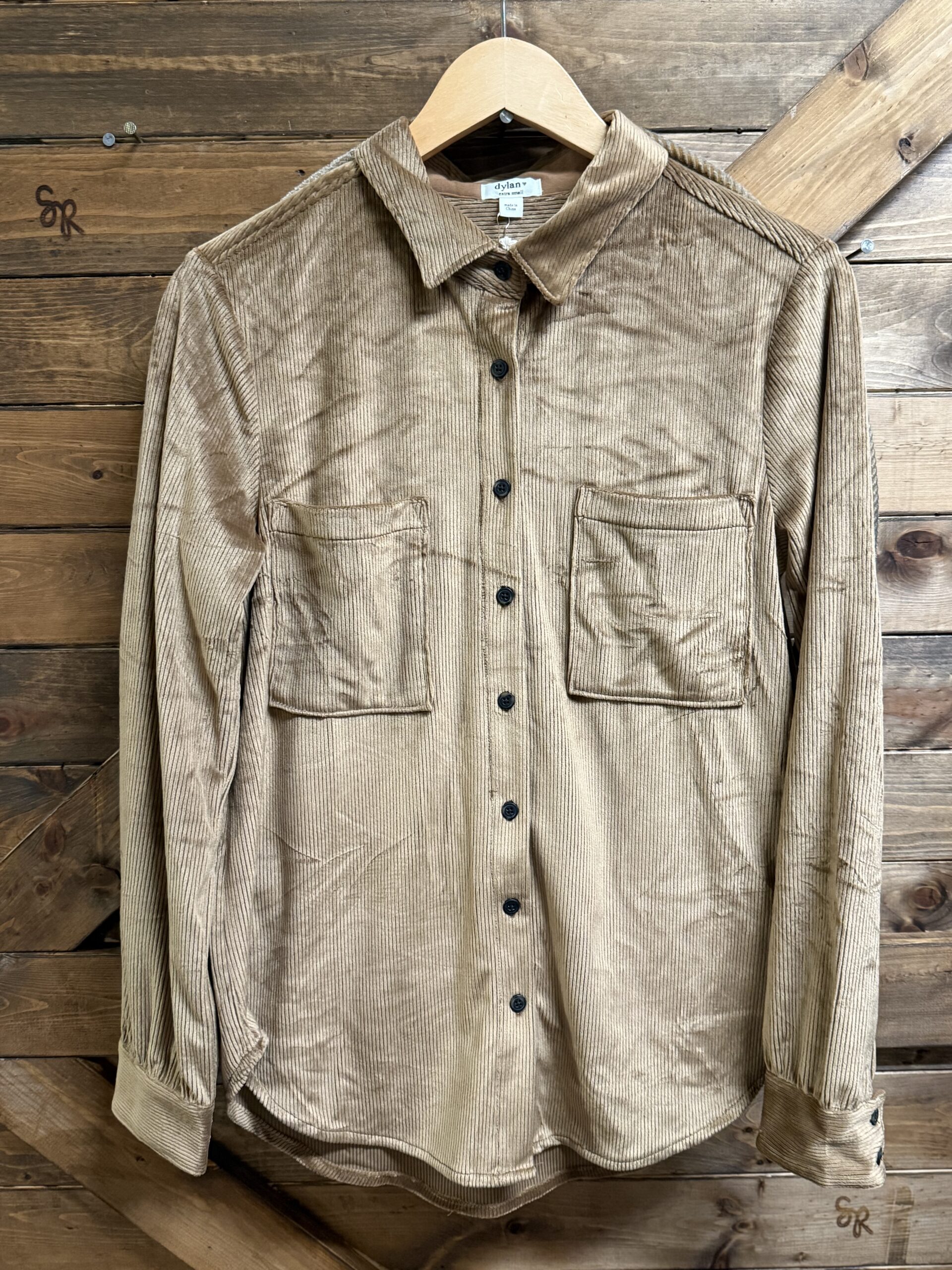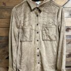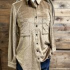 Corduroy is a favorite texture of ours! The look is always so good and what a perfect fabric for fall and winter! Pretty true brown corduroy with dark brown marbled buttons lining the front. The same buttons set at the sleeve end below a cute peep hole at the wrist. The chest features double front open pockets, one on each side. The collar lays as if it’s a dress shirt. Beautiful shirt! Wear it where your heart desires!