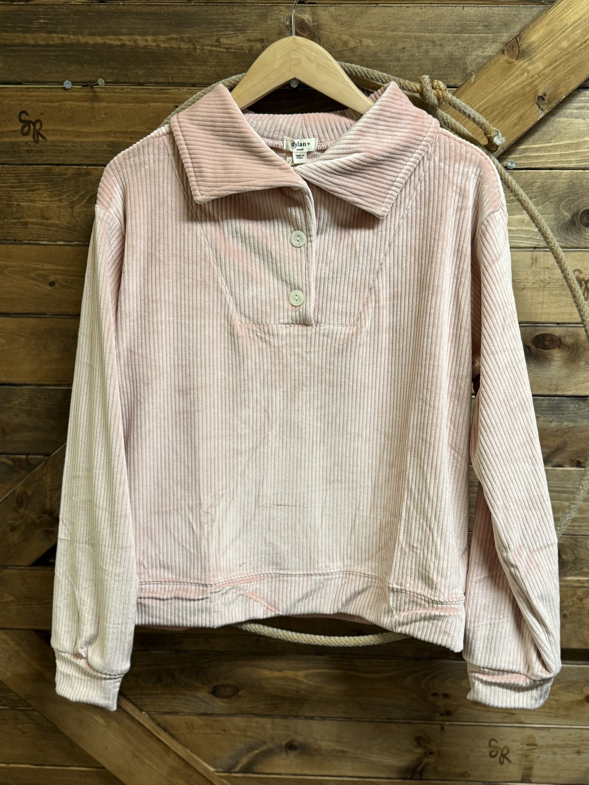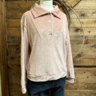 Pretty. Pink. Pullover. It’s one of our faves! Everything from the ribbed velour to the neckline and fit! Its comfy fit and soft feel make this the pullover that you don’t get caught without. Easily worn a few different ways! The pretty pearl buttons lead up to an oversized lay down collar. Wear it buttoned up alone or layer it with a button down for a dressier look. Style that can take on different approaches and never be uncomfortable. This will be the pullover you choose every single time!