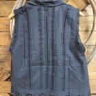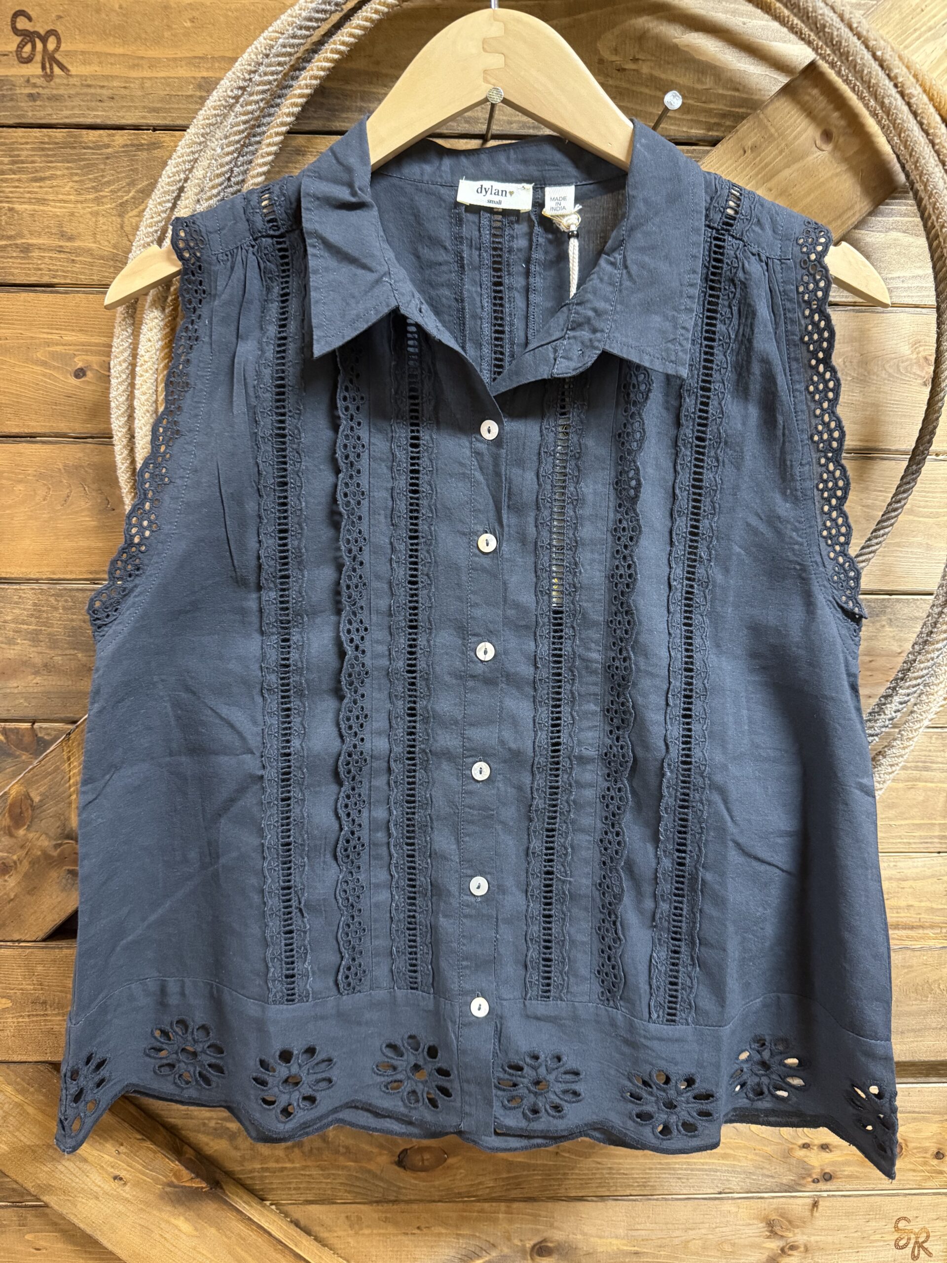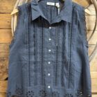 Milia is made for style! Pretty black tank that’s anything but ordinary! The shiny little buttons line the front starting at the collar. Each of the stripes is designed with a different and unique eyelet pattern. The sleeves are trimmed with a basic black floral eyelet. A pretty basic solid collar lays over and adds simplicity to the layout. Large floral eyelets complete the bottom hem all the way around. A dressy tank for all warm weather occasions!