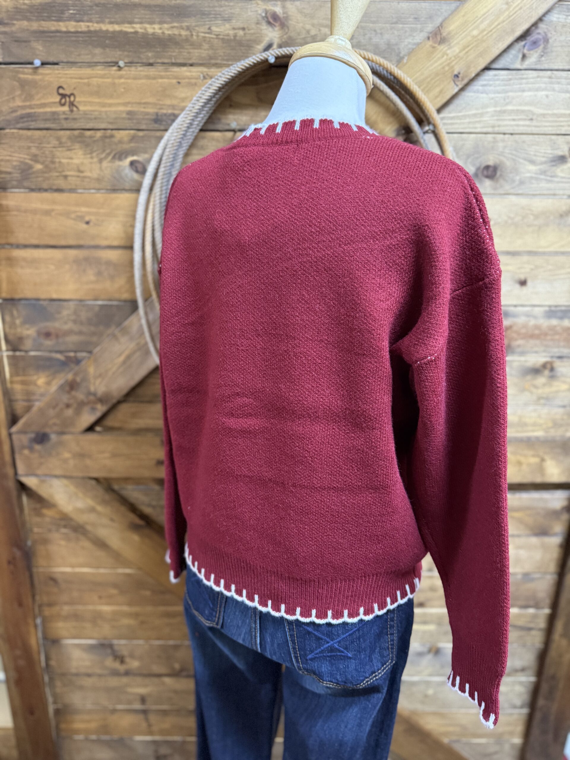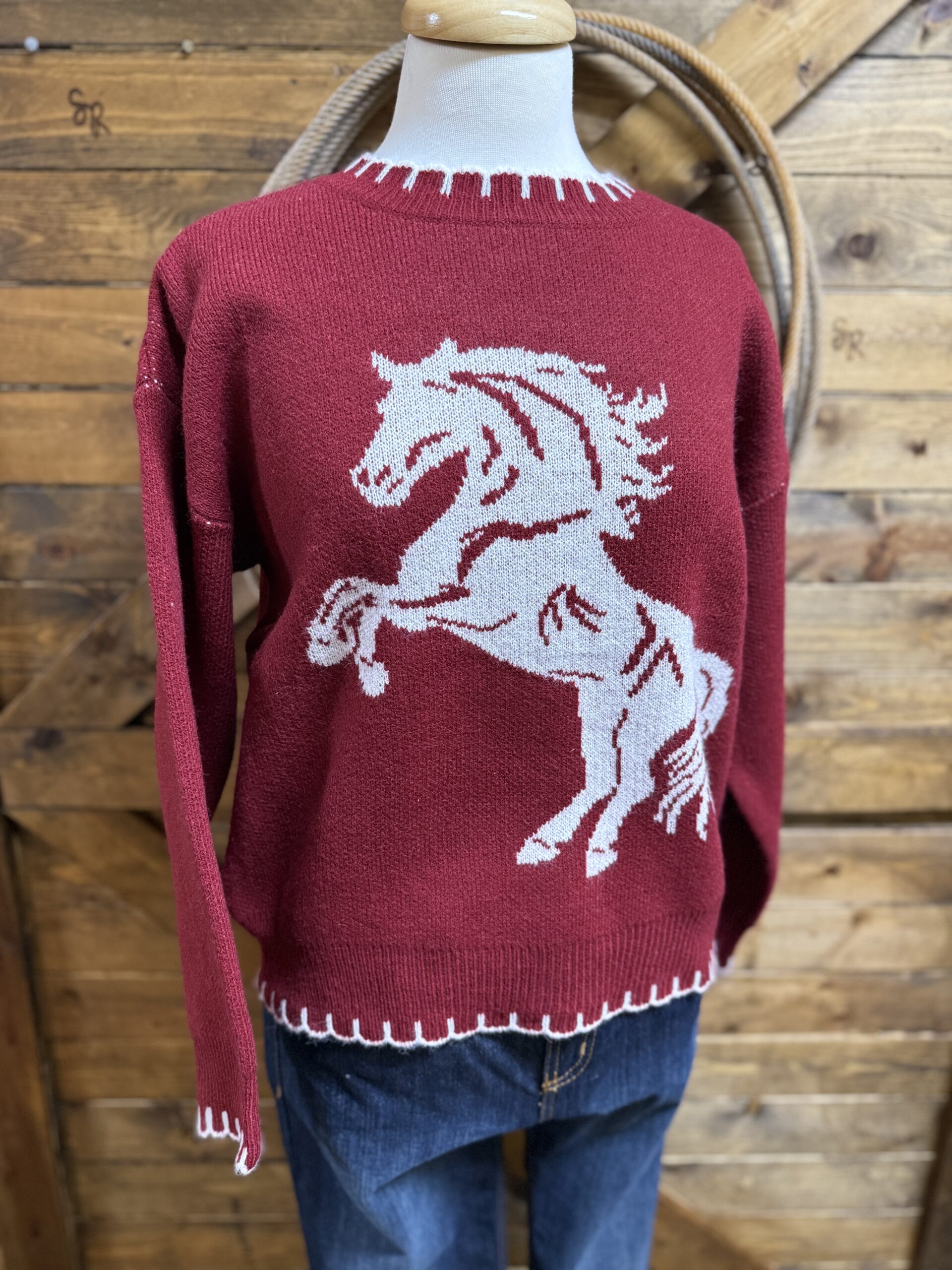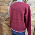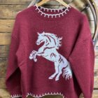 Details make all the difference! Pretty red knit sweater with the cutest white detail! The neck, sleeve ends, and the bottom hem are trimmed in an eye catching white knit. The outer hem is transformed by the knit into an elegant scalloped edge with the horse in a white knit featured in the center. Beautiful heavy sweater that can be worn layered or alone and still be as beautiful!