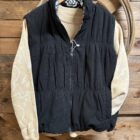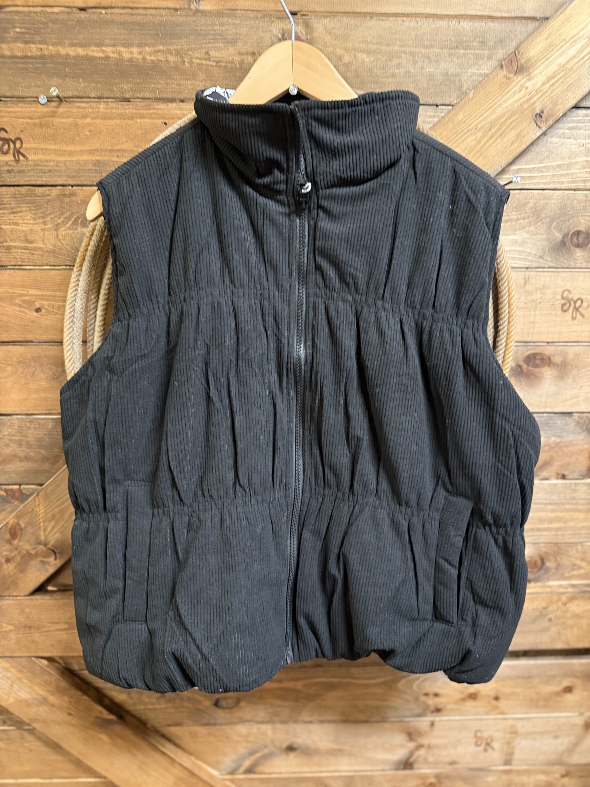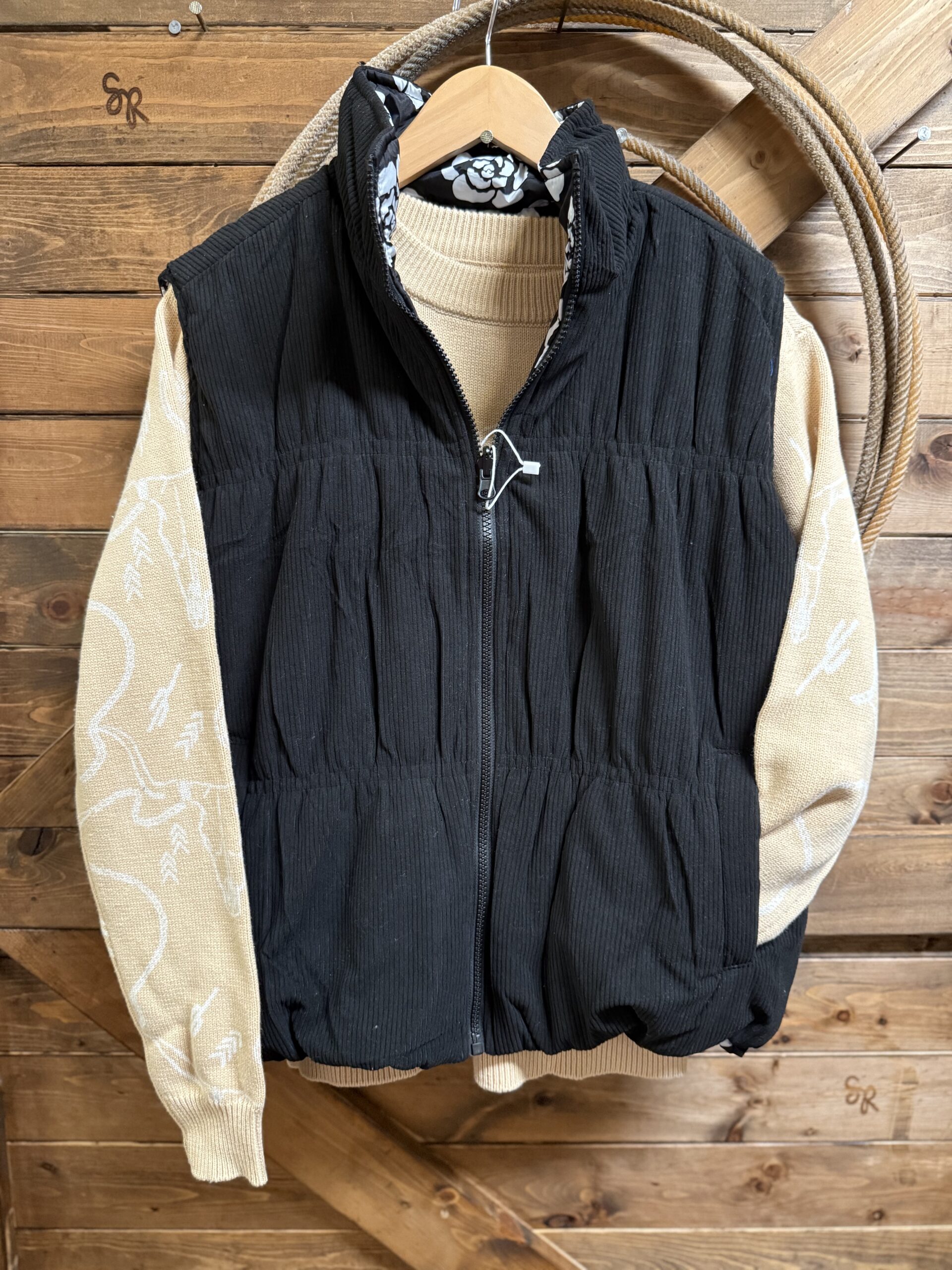 We have our eye on vests this season! This one has our attention to say the least. It’s reversible – solid black corduroy on one side and black and white floral on the opposite side. It’s a puffy layered style. Each of the three sections has added to fill to create the fuller look. A solid black zipper is featured on the front of each on with each side having single hand pockets for each hand. Easy to style, the solid color pattern can be worn with any color and and print or design while the floral side can be worn with any color of your choice. You can be bold and simple at the same time and yet be you. Wear it to your liking! Each side is its own and so are you!