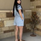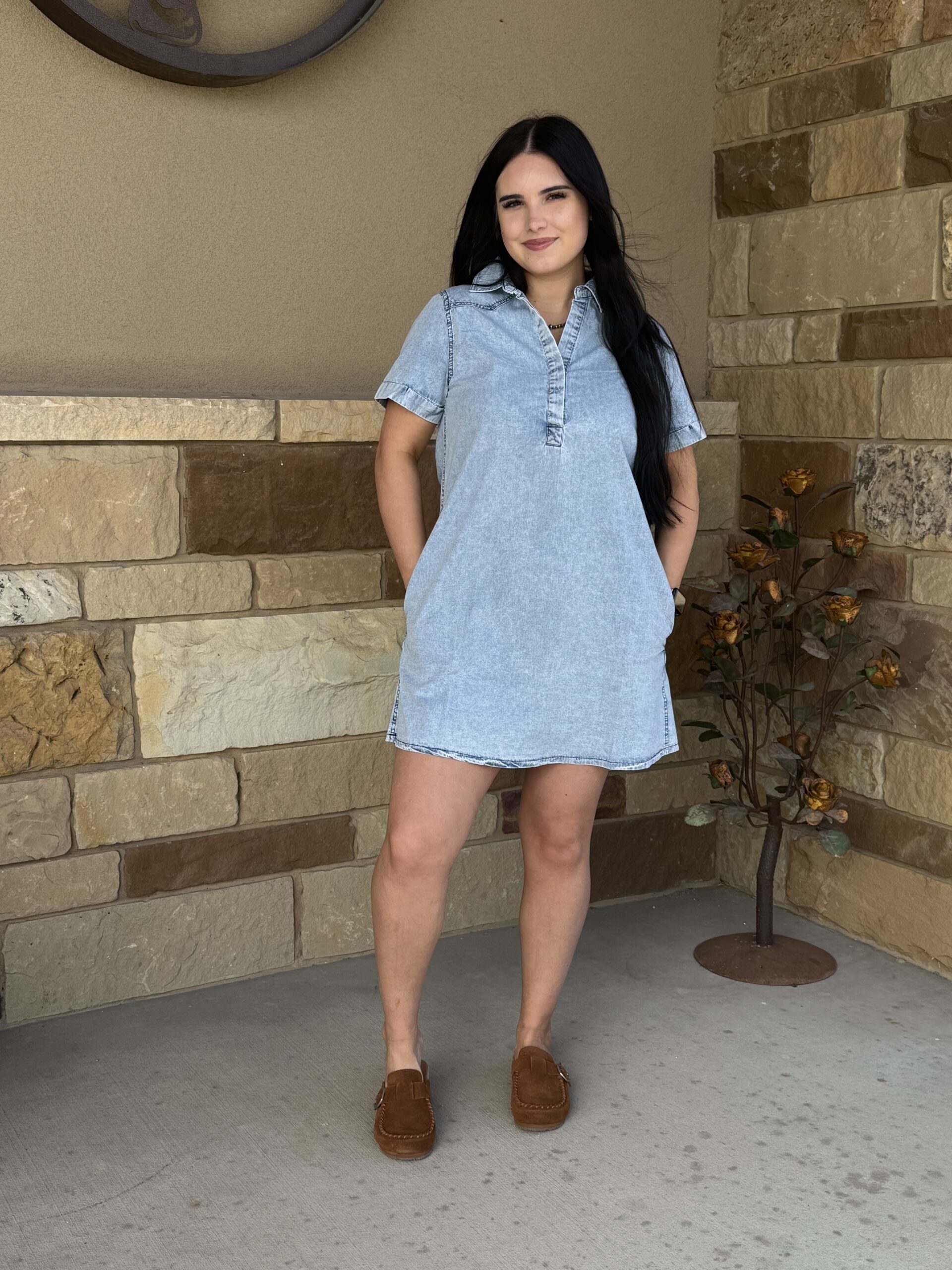The summer dress you have been looking for! Simple, Pocketed, Perfect Length, Lightweight, With Sleeves. All of those things in the same dress! The denim is a trend we can get behind! A simple light chambray creates a comfortable look that suits us perfectly. A cute v neckline comes down off of a lay down collar into a 2 snap, adjustment. Those snaps are the cutest little traditional pearl snaps. A full short sleeve is cuffed out on the edge and a pocket is located on each hip with a snap closure in the center. Those snaps are laid under the material leaving a plain simple look. Grab your favorite kicks, sandals, tall boots, booties, we don’t care, they all go with this dress! Its the best universal piece you will add to your closet this season!
