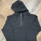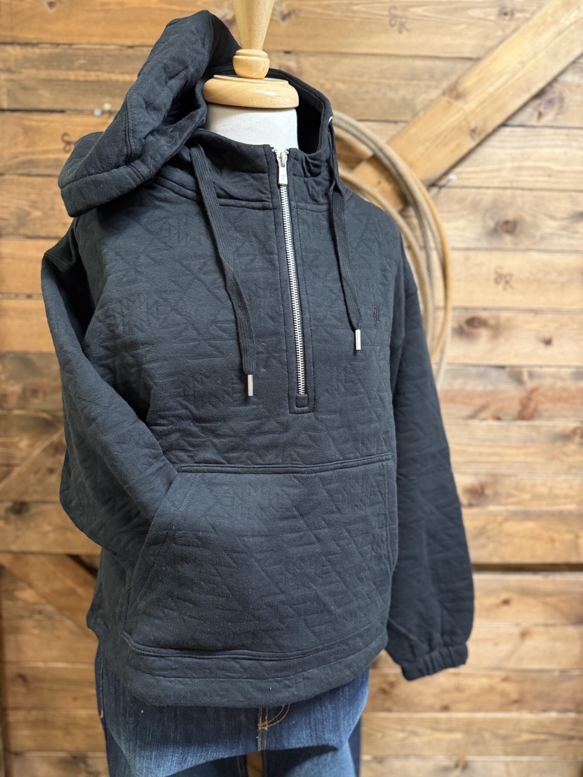 A hoodie but not like the rest! It’s a quilted aztec hoodie. The single large pocket across the bottom is easily accessible for both hand. A cute silver zipper comes down off of the neck with a2 tie strings. The Hooey H is embroidered in color matching thread on the left side of the chest. Its a fancy little hoodie!