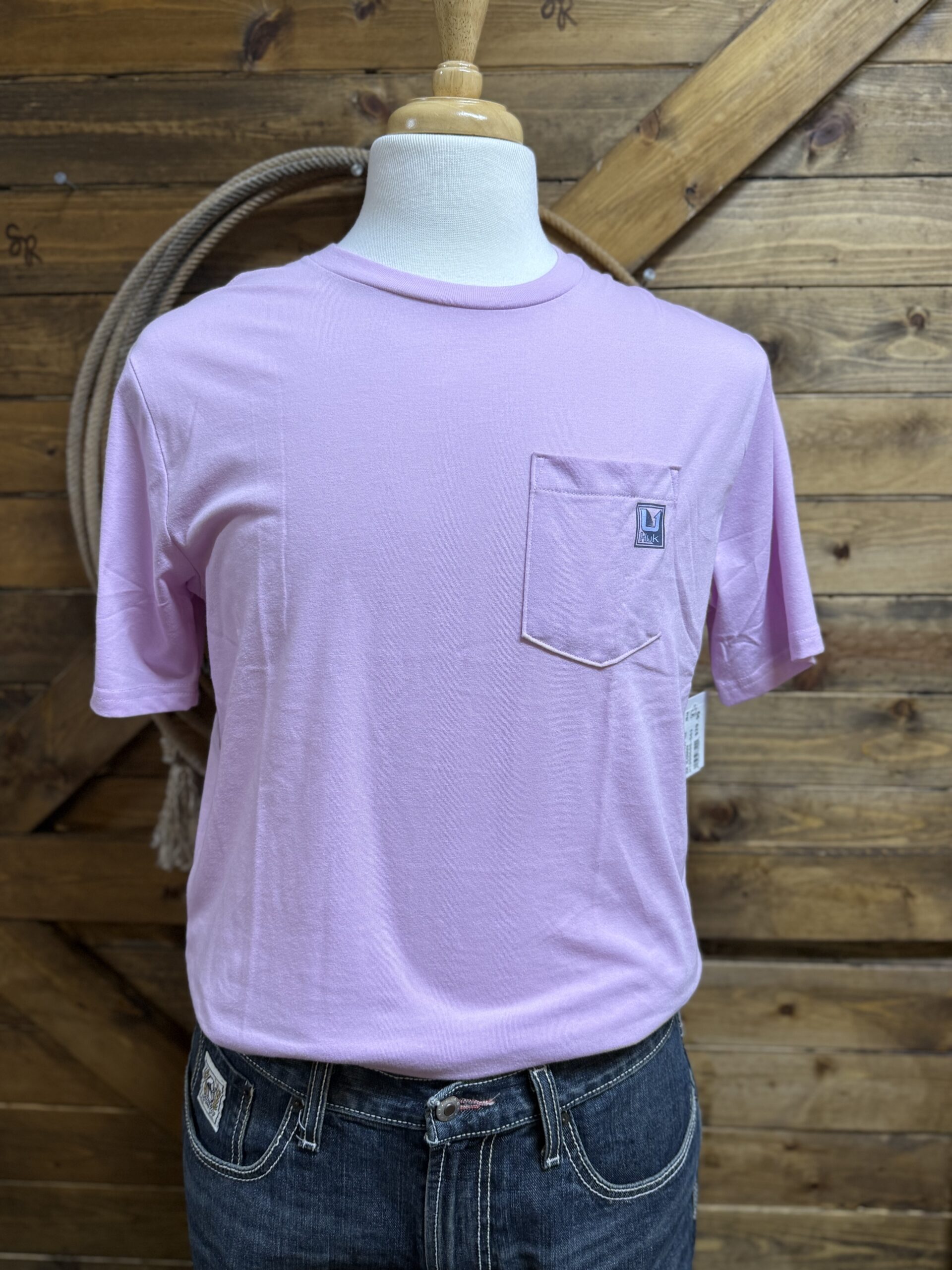 Good graphic tees are something we need multiples of! Cool dull pink basic tee features an open front pocket with the Huk graphic in the corner. The back features the same graphic centered in washed blue tones. The color combo is so eye catching and refreshing. Grab this one for everyday!
