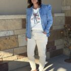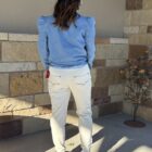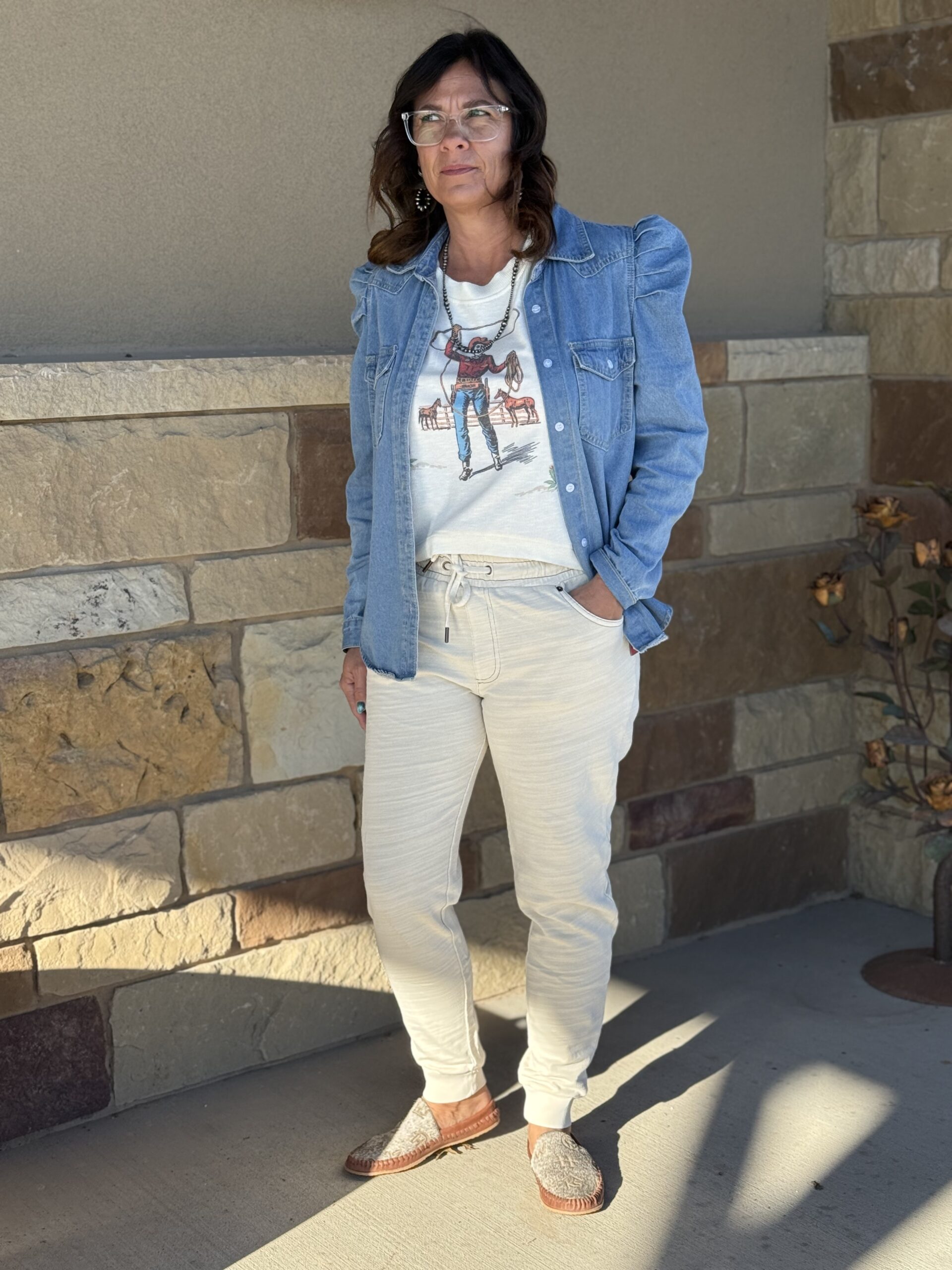 Comfy pants!!! Yesss, we are here for the style and fit! Super soft and super comfortable all in the best color! You can literally pair these up with anything of any color. The waist is a comfortable wide elastic band with a draw string coming together front and center. A stitched fly and usable side pockets resemble that of a traditional pair of Kimes jeans. The back is designed similar to denim as well. A full back pocket on each side features the Kimes logo embroidered in a beautiful metallic brown thread reaching from one side to the other. Copper brads are at the top corners of each of the rear pockets. The fit is perfect. It’s a looser top closing in on a narrow bottom hem for a fitted jogger look. So cute and comfy, they will take you across multiple season comfortably. You need them!