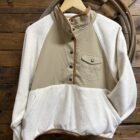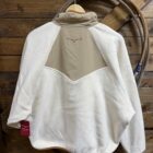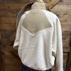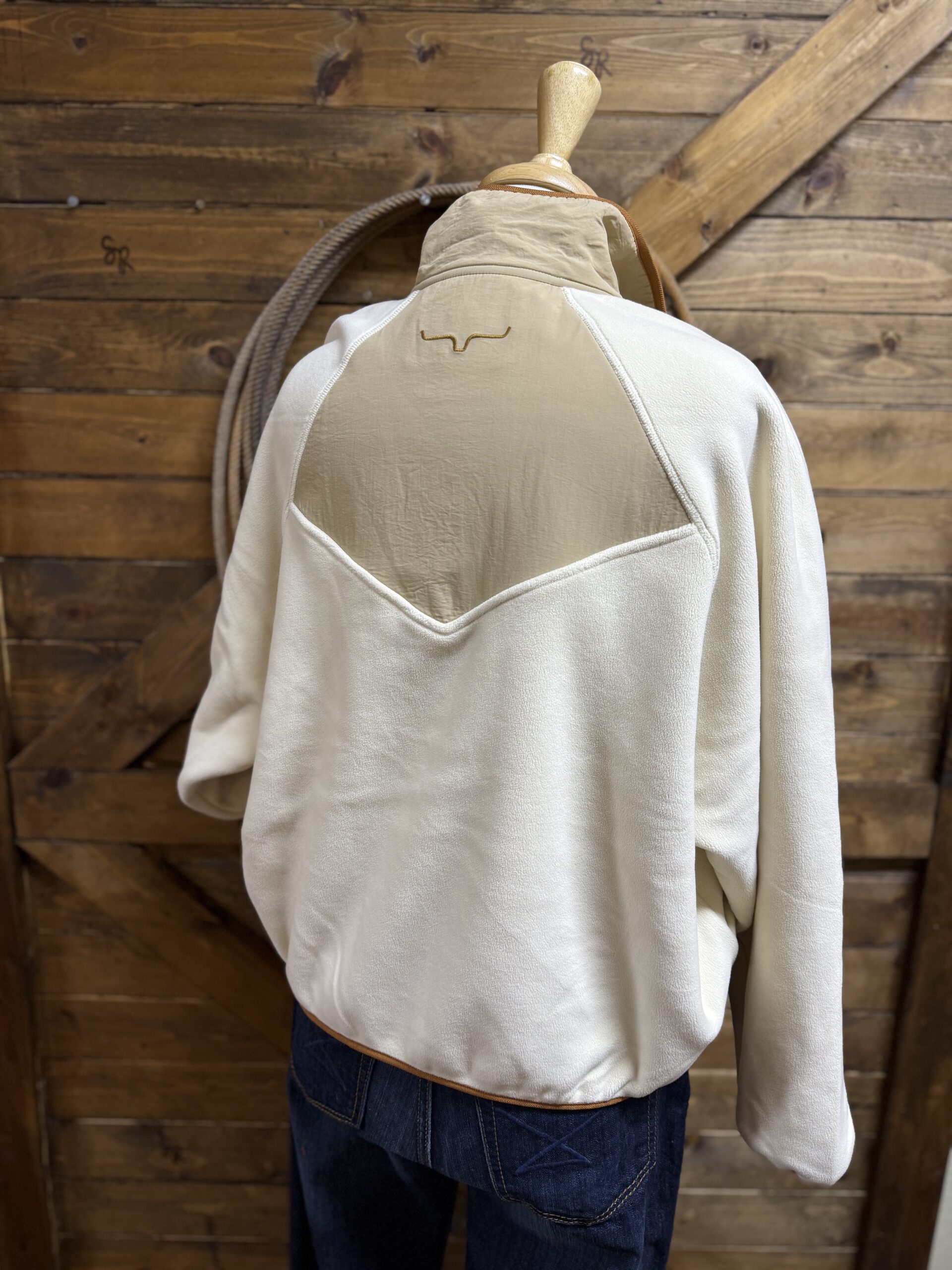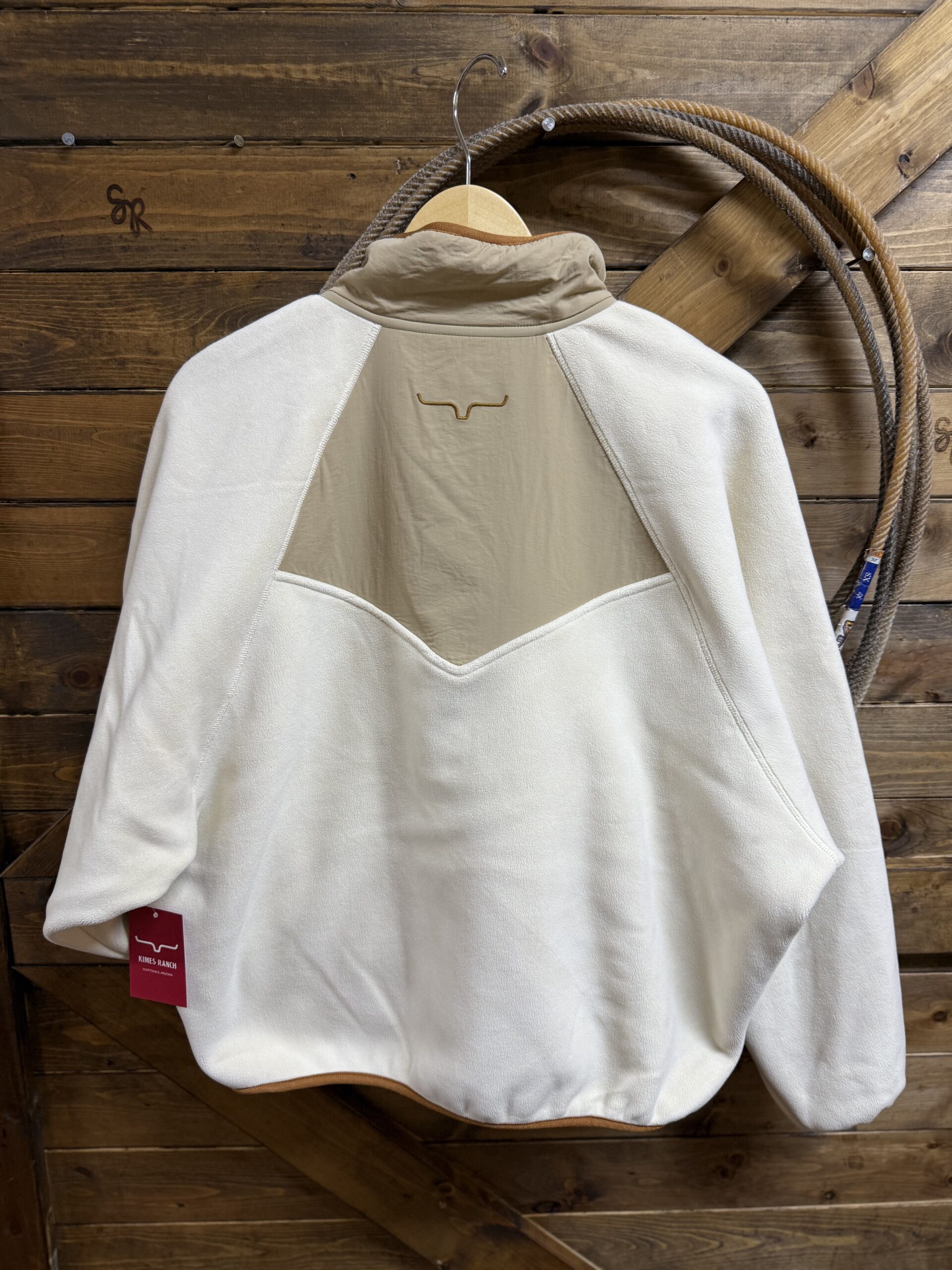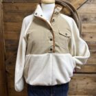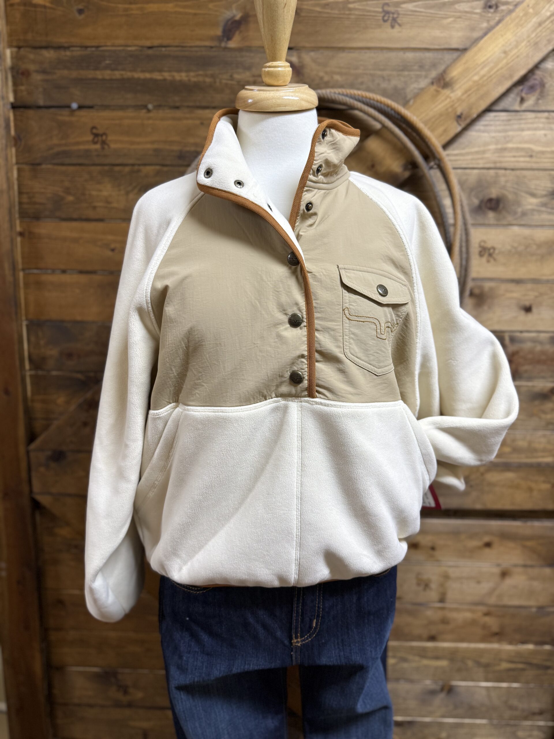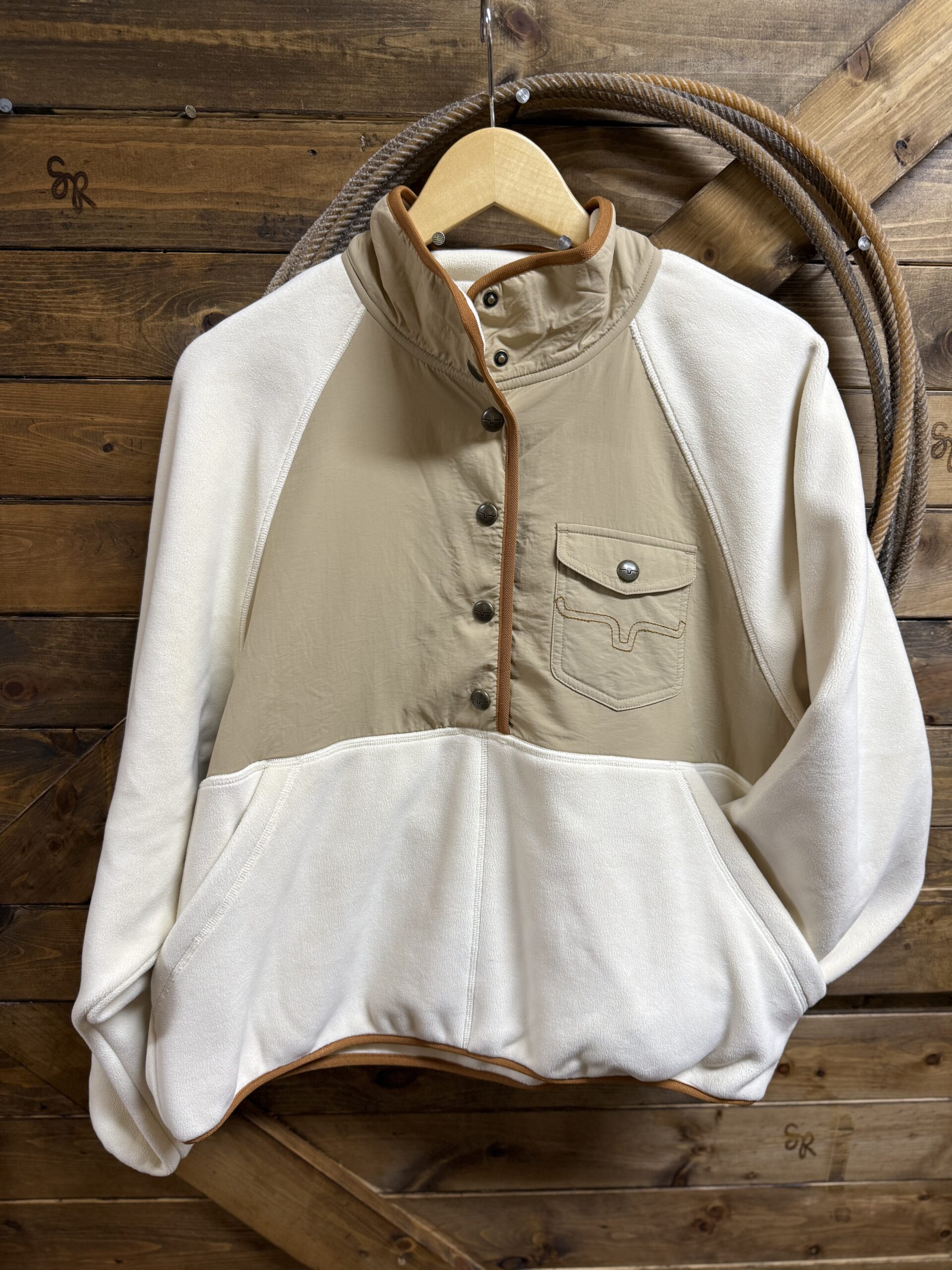 It’s a new favorite from Kimes! The cutest pullover with a 1/2 snap! The color combination is perfect, a natural 1/4 body and a soft white fleece make this a need. The colors match all tones of denim and even your favorite colored denim. Easily creates a western look and style or transitions easily. A double snap on the stand up collar followed by a 4 button pattern allows the neckline to be adjusted to your preference. The cutest Kimes labeled pocket sets on the left side of the chest with a flap closure on a snap. Two single oversized hand pockets cover the front lower portion. The opening to the pockets is a wide slit pocket. The neck, hands, and waist are all trimmed in a brown elastic material drawing in the sleeve and waist. The back features a small section with the Kimes logo for a sleek look. You will want this one!!