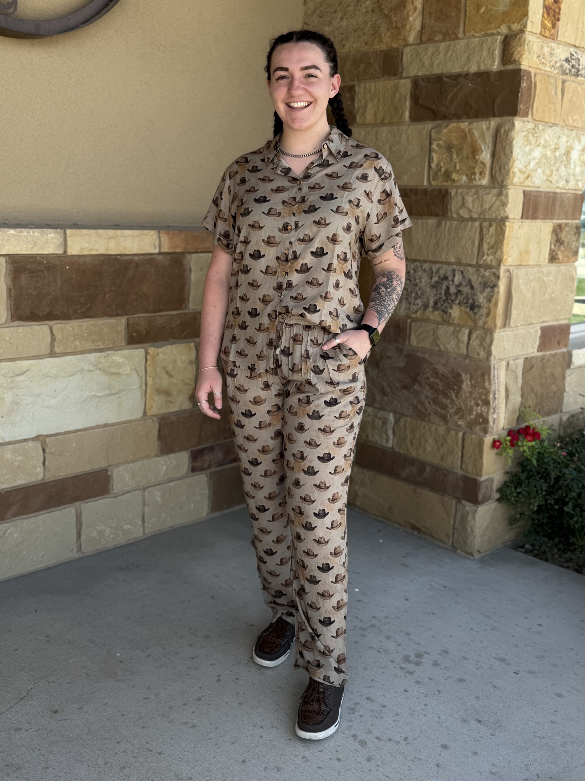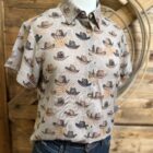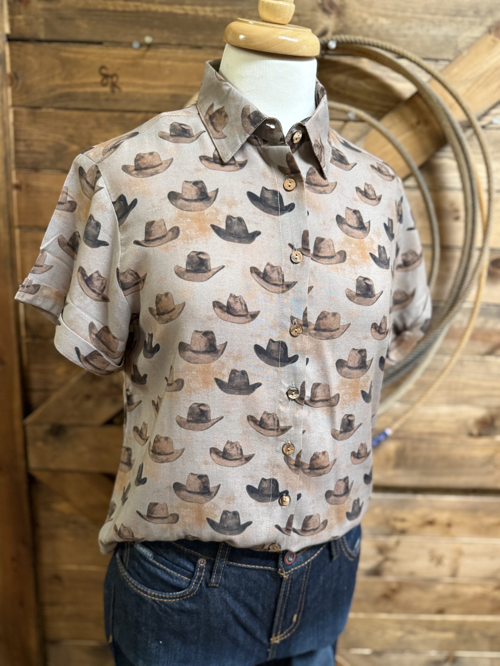 It’s sooo cool and sooo us! Say Hello to Calamity! She is a great lightweight shirt sporting cowboy hats in our favorite colors! A cuffed short sleeve and collar make for a very nice clean look. Cork buttons go down the front in a color match pattern. The tail of the shirt is a bit longer making a few different ways you can style and wear. Dressy and casual, it fits both occasions. Everything about it is good! Now, go find Jane!