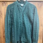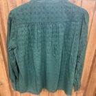 We have had this top in several colors and this may be the prettiest of them all! Beautiful dark forest green in a long sleeve. The material layered across the front features different layers of eyelet, ruffles, and solid panels. Dainty buttons made of the same material line the front starting at the short v neck. A shorter collar is made of a short ruffle and wraps around into the shallow v neck. The back is the same simple eyelet in a solid panel. Perfectly made for al of the holiday gatherings! Looks so elegant styled a variety of ways!