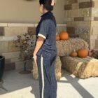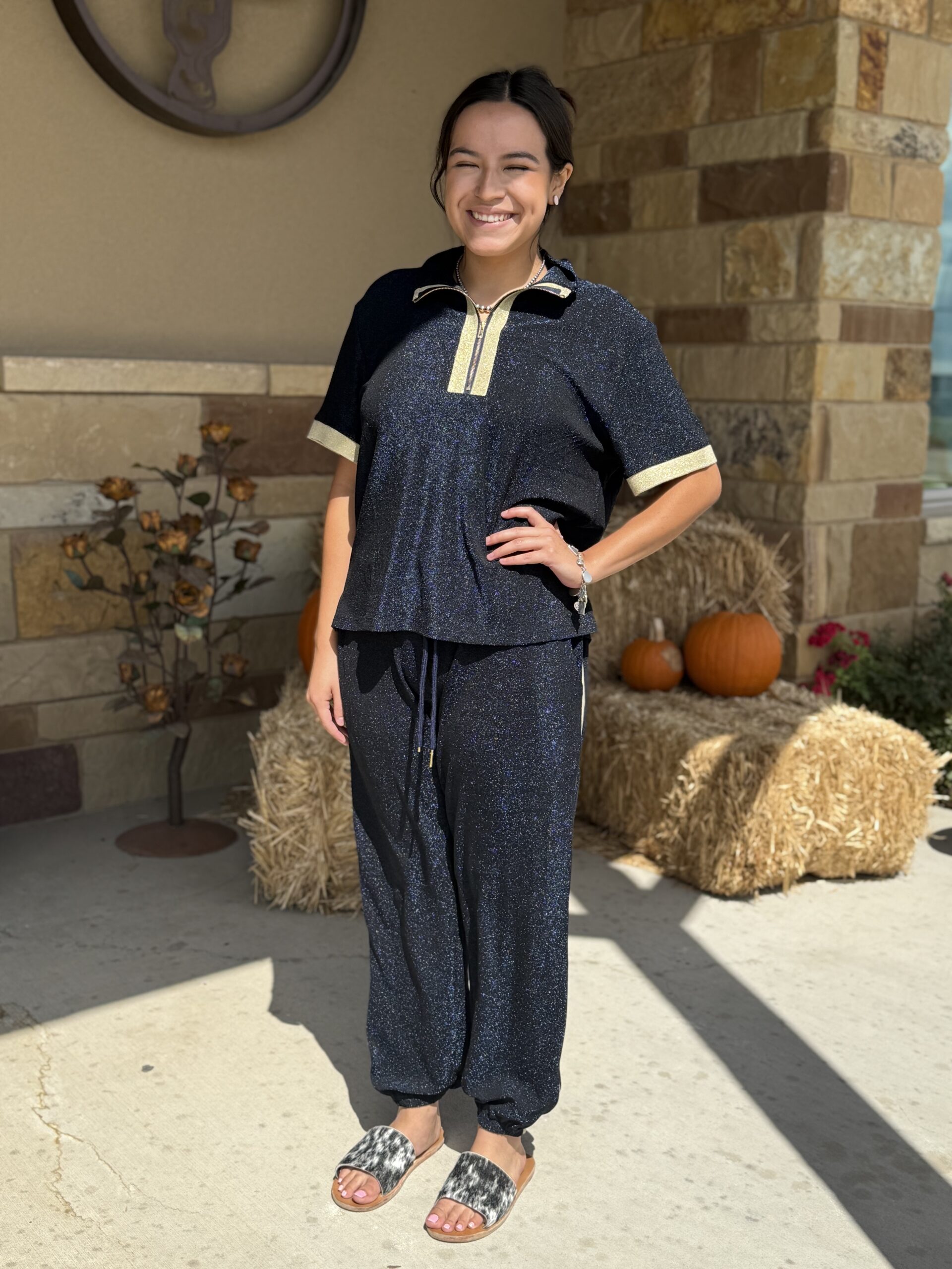 Pretty…….Sparkly! We love a good shine! Pretty deep navy twinkle top has all of the little sparkles you could imagine. The sleeves and the 1/4 zip are a pretty gold twinkle creating an elegant color pattern. The lightweight material is stretchy for the most comfortable fit and elegant look. It pairs with a matching shimmer pants in the same color pattern. Cute outfit, comfy fit, and elegant style!