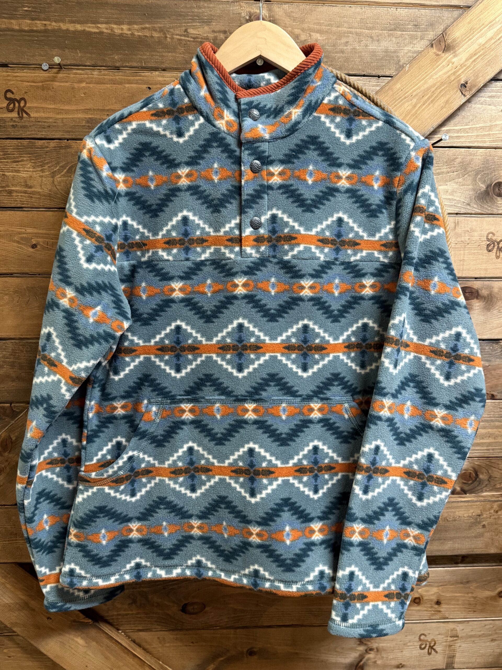 It’s always a great idea to have a comfy pullover on hand! We think this one may be a good fit! The aztec printed fleece is as comfy as it looks! I promise. A neckline that is trimmed in a pretty deep rust braid and 3 snap buttons coming off of the short standup collar. A full length single front pocket is accessible from each side. Designed with a warming technology that is sure to keep you warm. It’s easy to toss in the washing machine for easy care. The kind that is made to throw on and go!