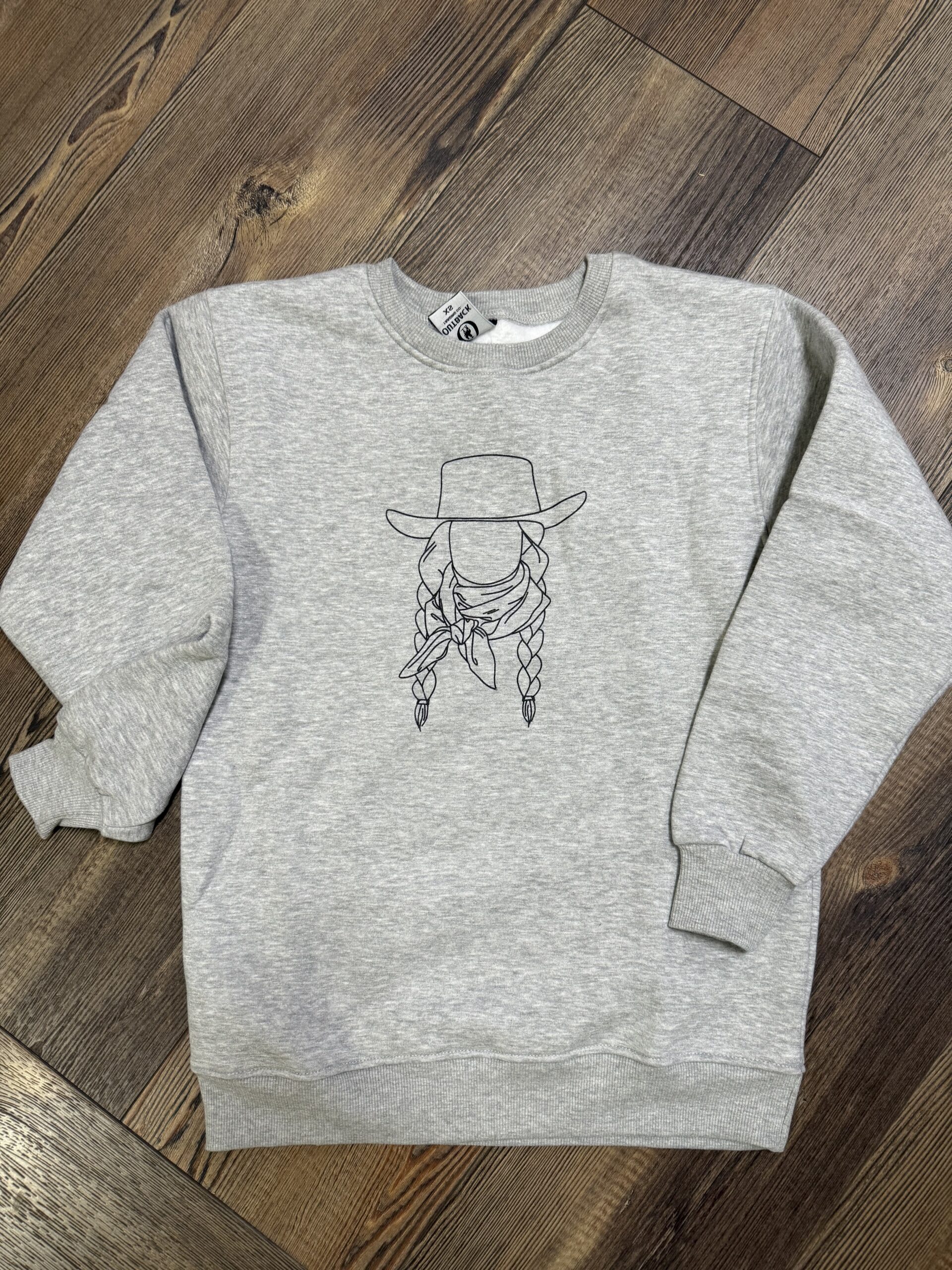 We can’t get enough of this crew neck! The graphic is simple yet so perfect! It’s the simplicity of the cowgirl on a basic grey crew neck sweatshirt. Cowgirls, y’all better get ya one of these fleece lined sweatshirts! They are so0o you!