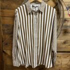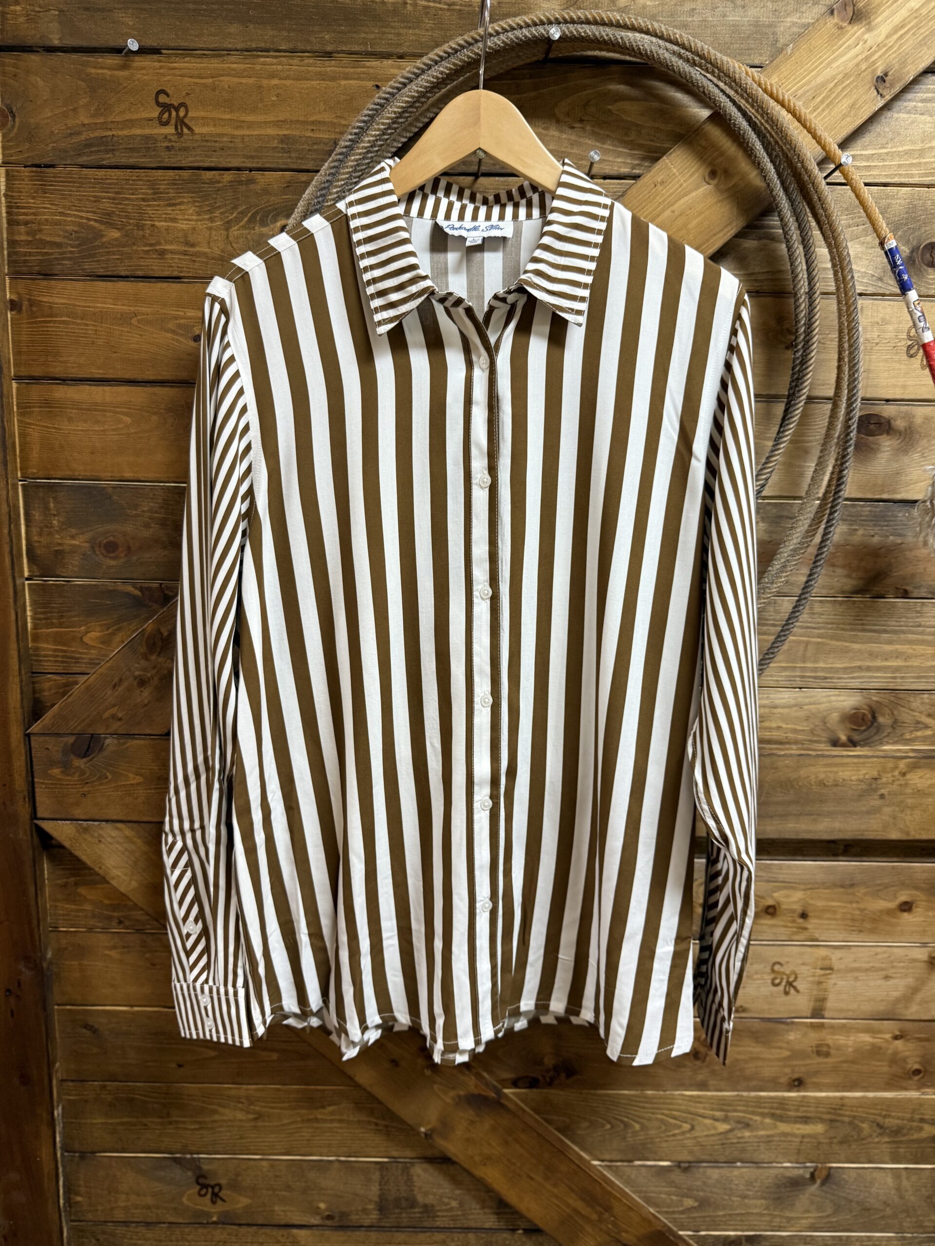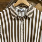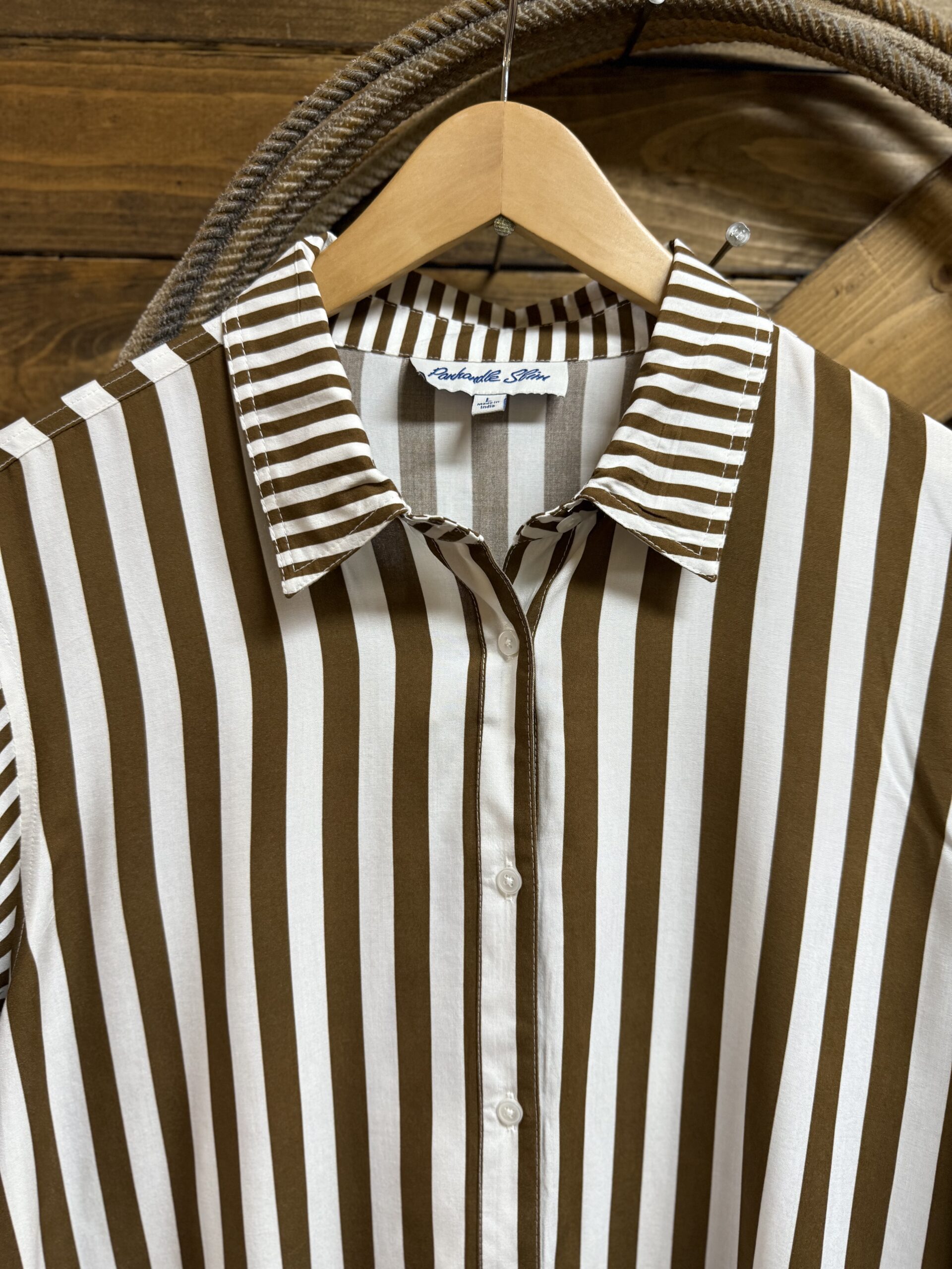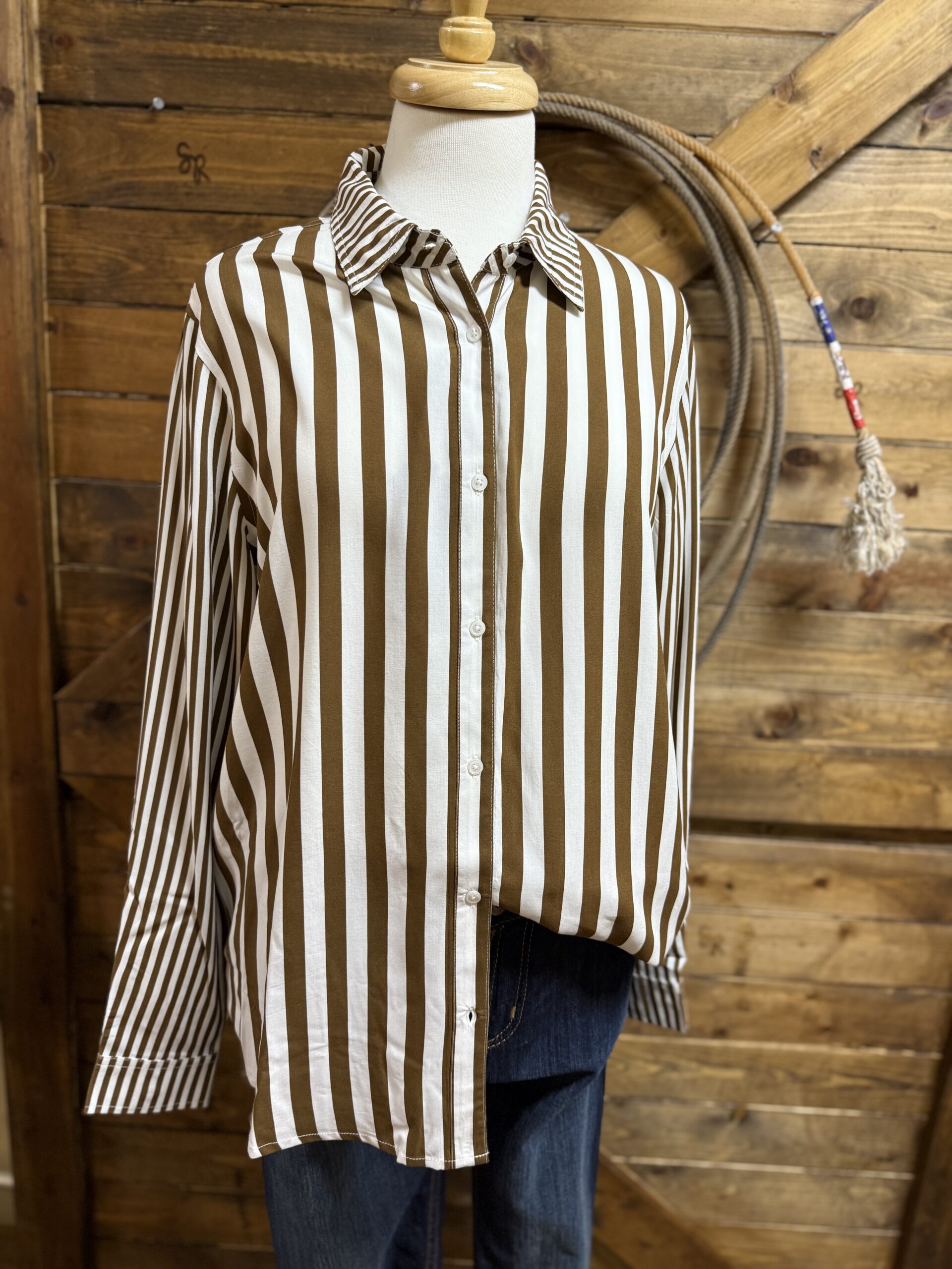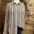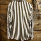 A top you can wear anywhere! Pretty brown and white stripe top suited for a variety of occasions. Designed with a light weight material, the front features classic white buttons down the front and again at the sleeve ends. Larger stripes make up the body of the top with the collar and both sleeves transition into a small stripe pattern. It can be dressy or it can be casual, you decide. We like it for both! Universal style and beautiful, we think its a must have!