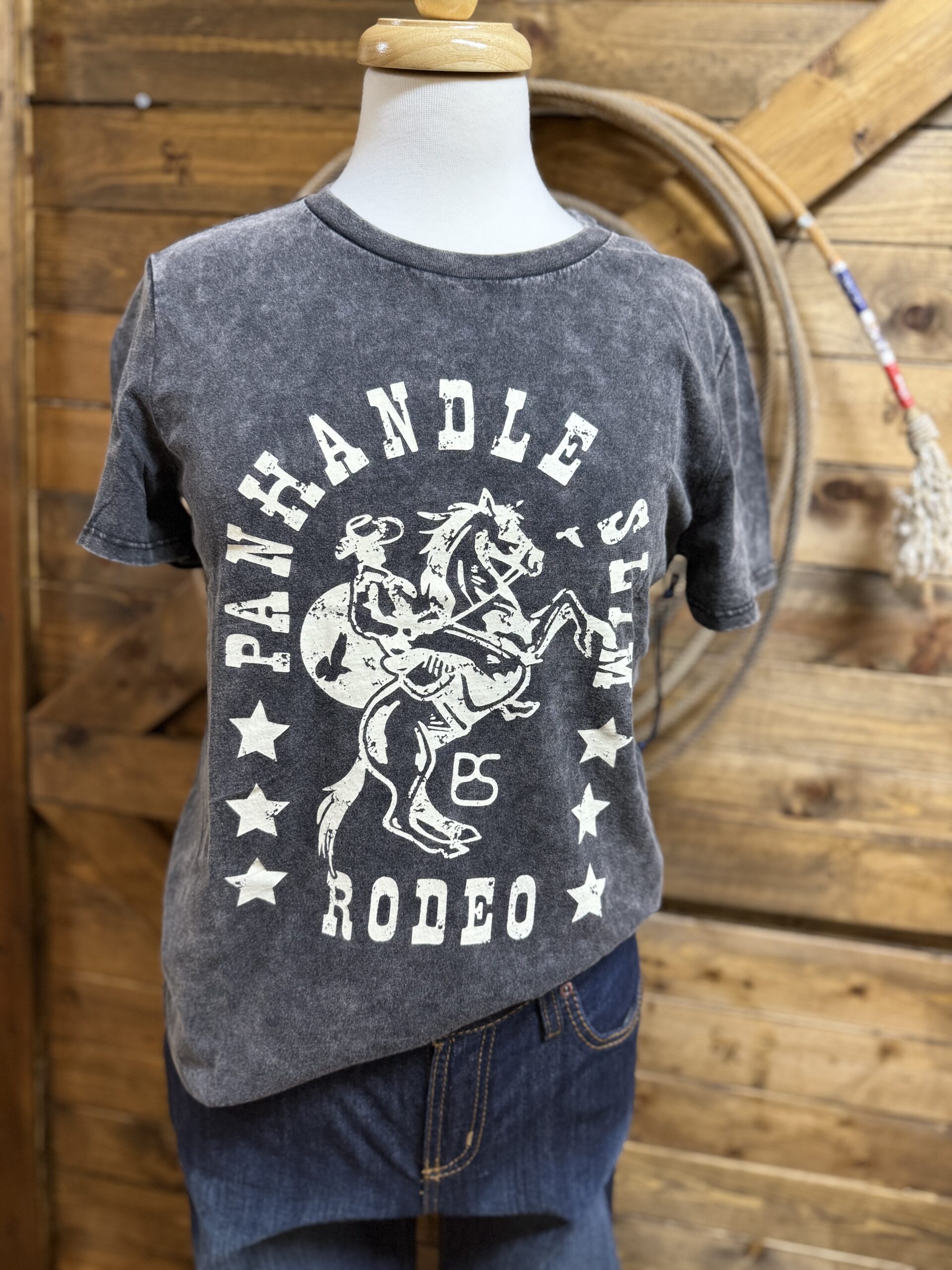 The good kind of tee! The one you can wear with anything for anything to anywhere! Super cool washed out black in color with a white rodeo graphic centered on the front. The graphic carries the same washed look creating a vintage-ish look. Super soft and comfy and cute! Warmer weather is here and this one fits the vibe for summertime! I promise it goes with everything! Jeans, shorts, skirts, leggings, yes all of it!