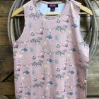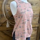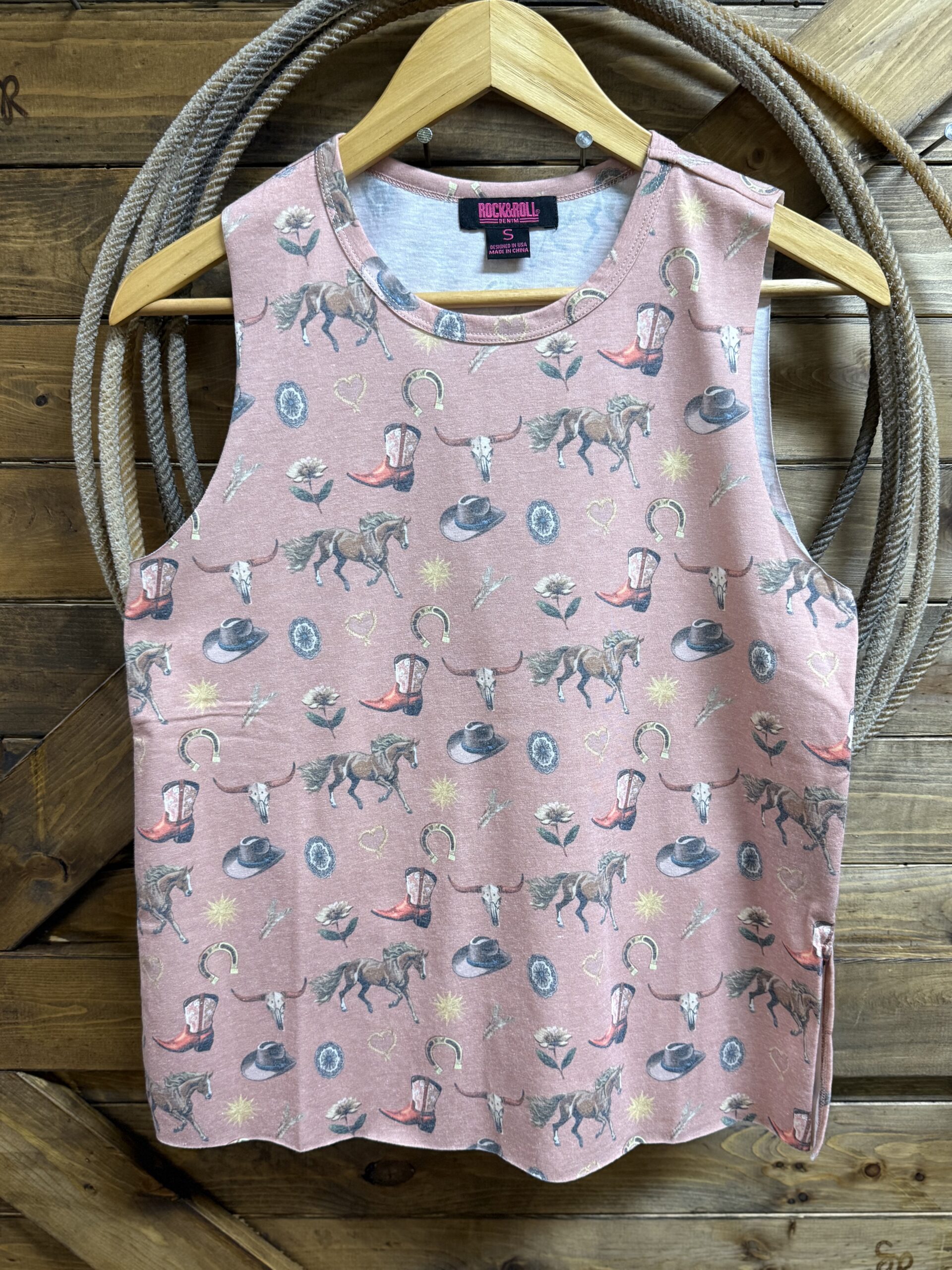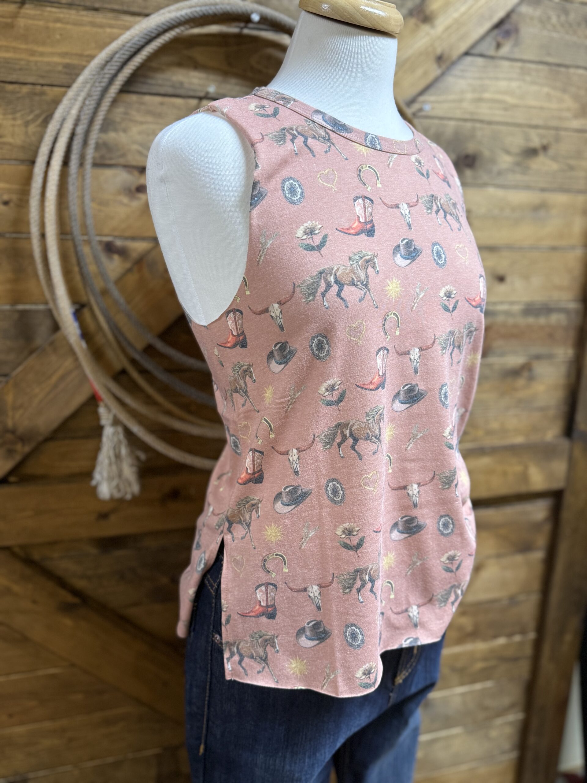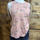 Tanks…..a closet must have! Pretty dull pink tank with all of our favorite western things! Printed all over, both the front and back alike, are western staple pieces on a pretty dull pink tank. Raw hems make up the sleeve opening and the bottom hem as well. Each side has a 5″ slit from the bottom hem up. Great look for days in the barn or round pen, errand around town, or layered on a cooler day!