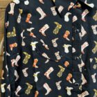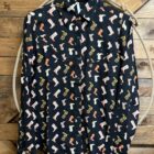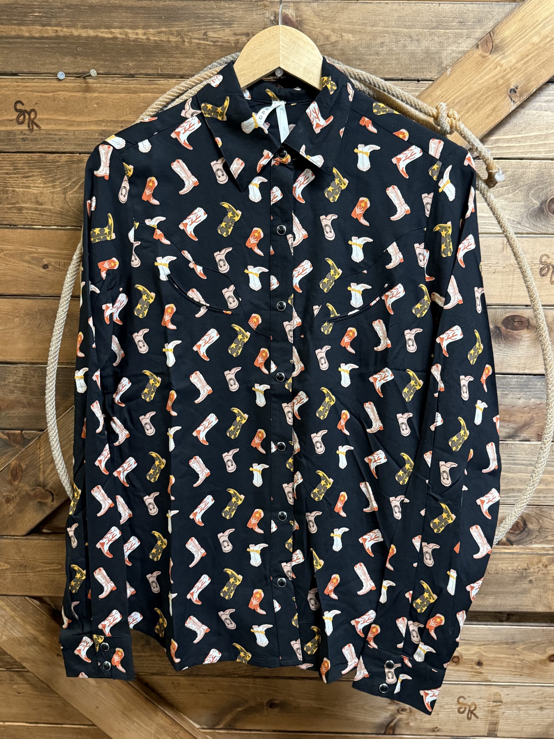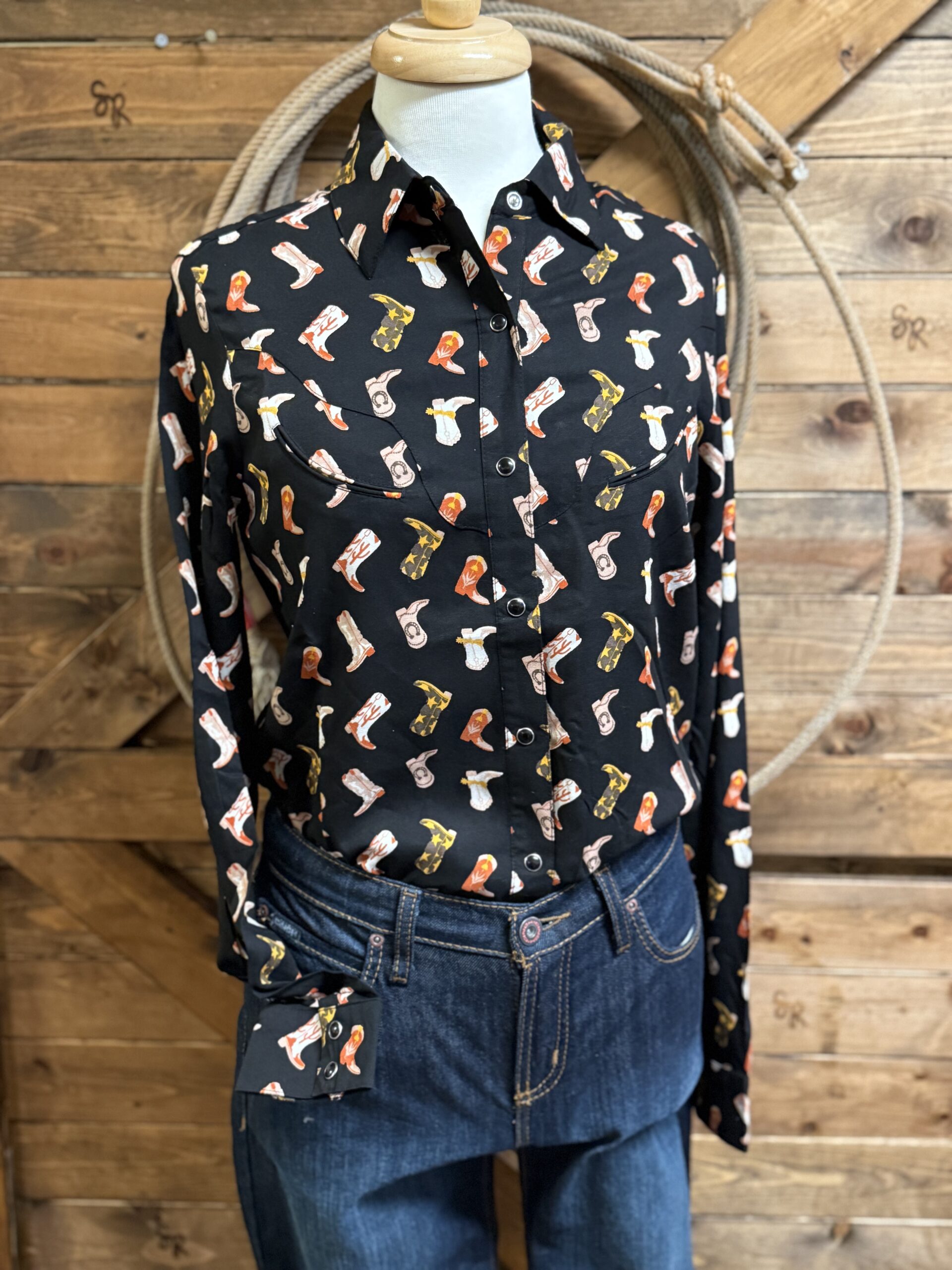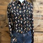 Western blouses don’t have to be boring! A pretty black long sleeve top with the cutest western boots scattered all over. The boots are in many different patterns and colors which allows you to easily wear your favorite colored tall boots. Beautiful black pearl snaps line the front and set on a 2 button row at the cuff. A deep western yoke comes down across the front of both shoulders and carries the design across the back of the shoulders. Slanted darts lay under each yoke seam on the front. Worn as a traditional western button down blouse yet styled with a modern vintage look in mind. It can be as dressy or casual as you choose!