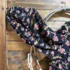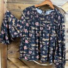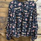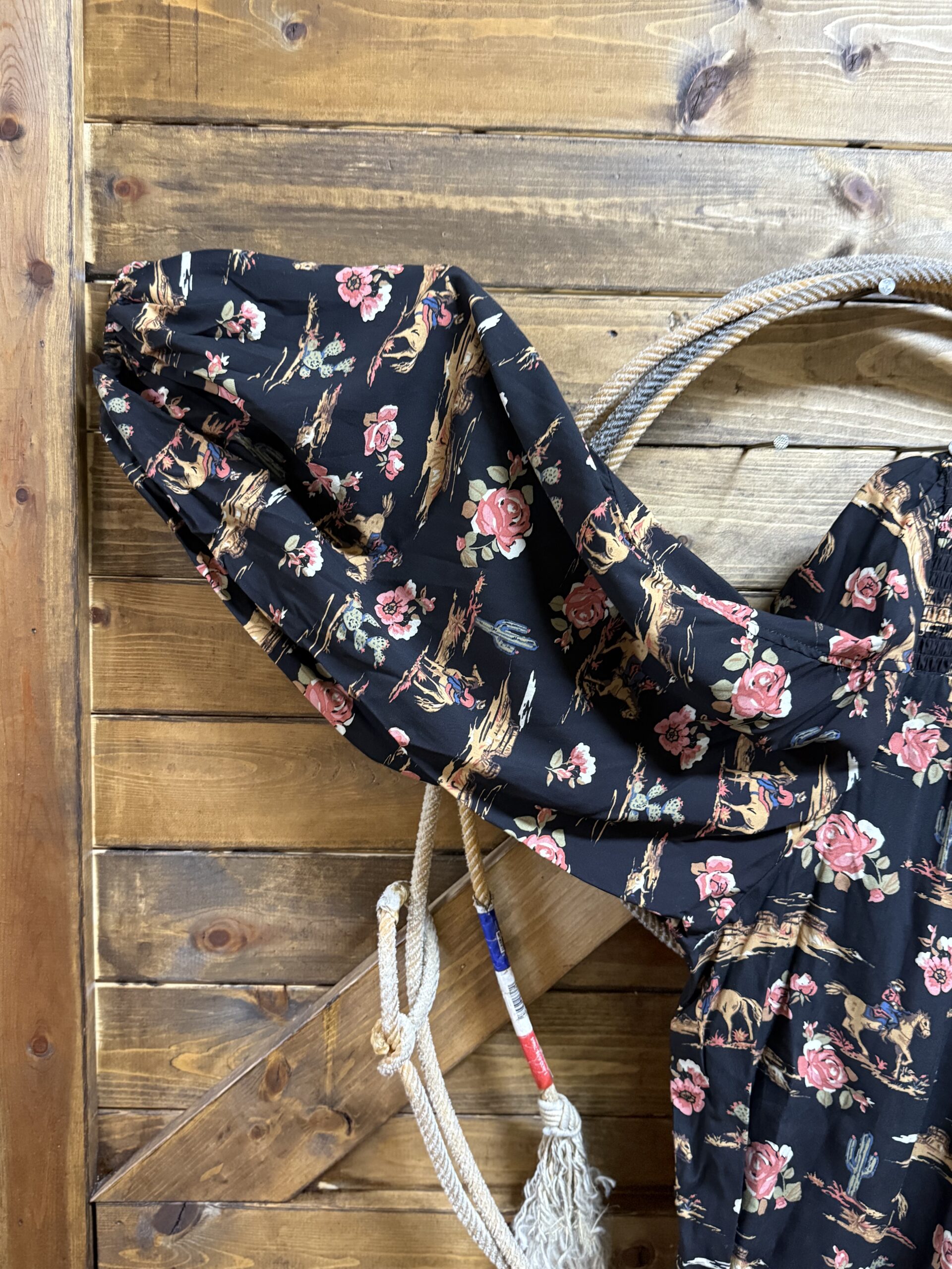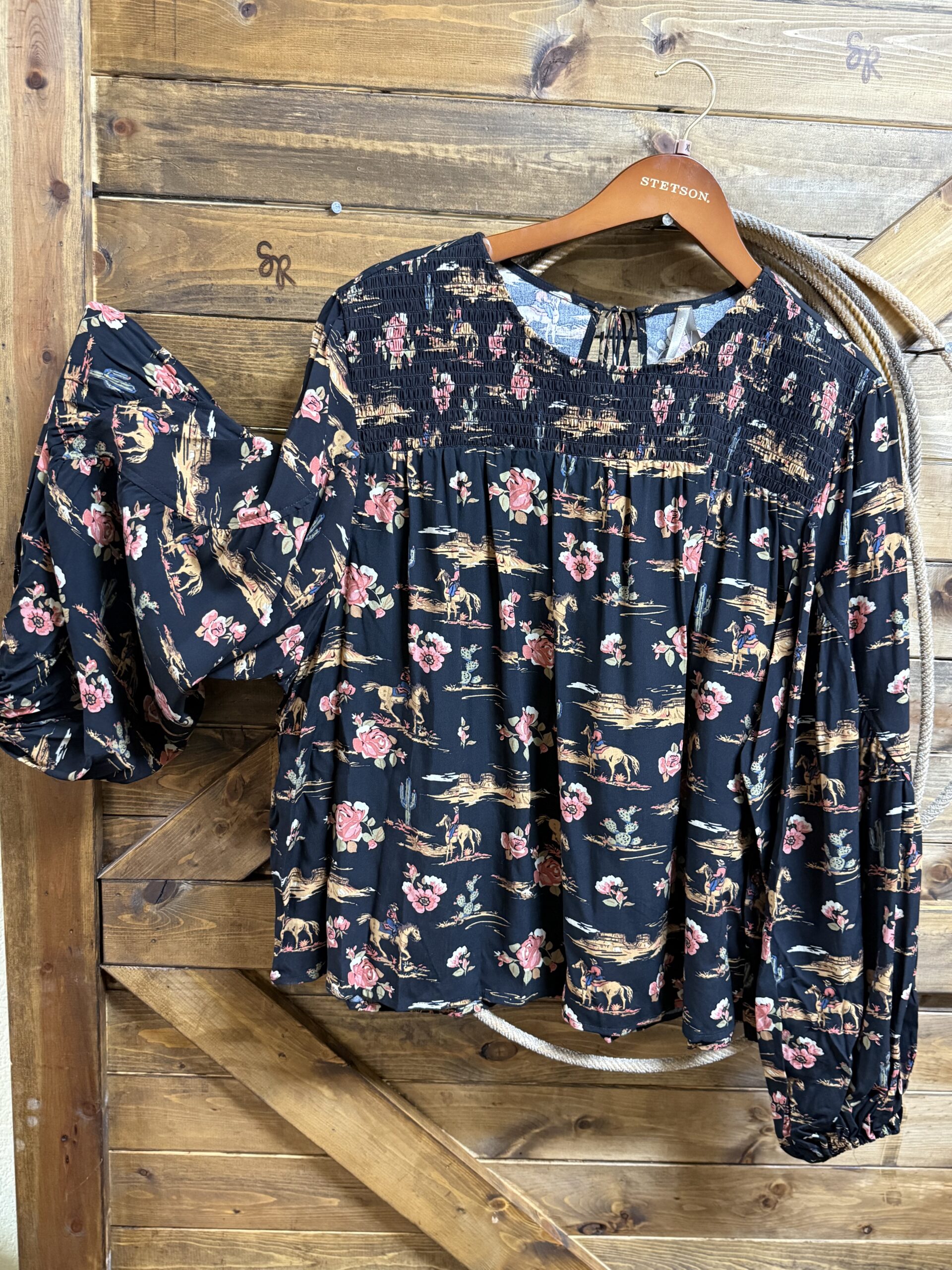 Add to closet! Skip all the things and put this in your cart! Beautiful black blouse features horse riders, and flowers, amongst a western scene. The fit is as fabulous as the style here! Made to fit loose, the ruched upper top creates a pleated flowing fit from there down. A rounded scoop neck line matches this fit perfectly. The back of the neckline has a keyhole with a tie at the neck. A true balloon sleeve comes to a close at the wrist with an elastic band. This top is the one-The one for all things that require you to put on your best! You will not be disappointed in this top!