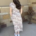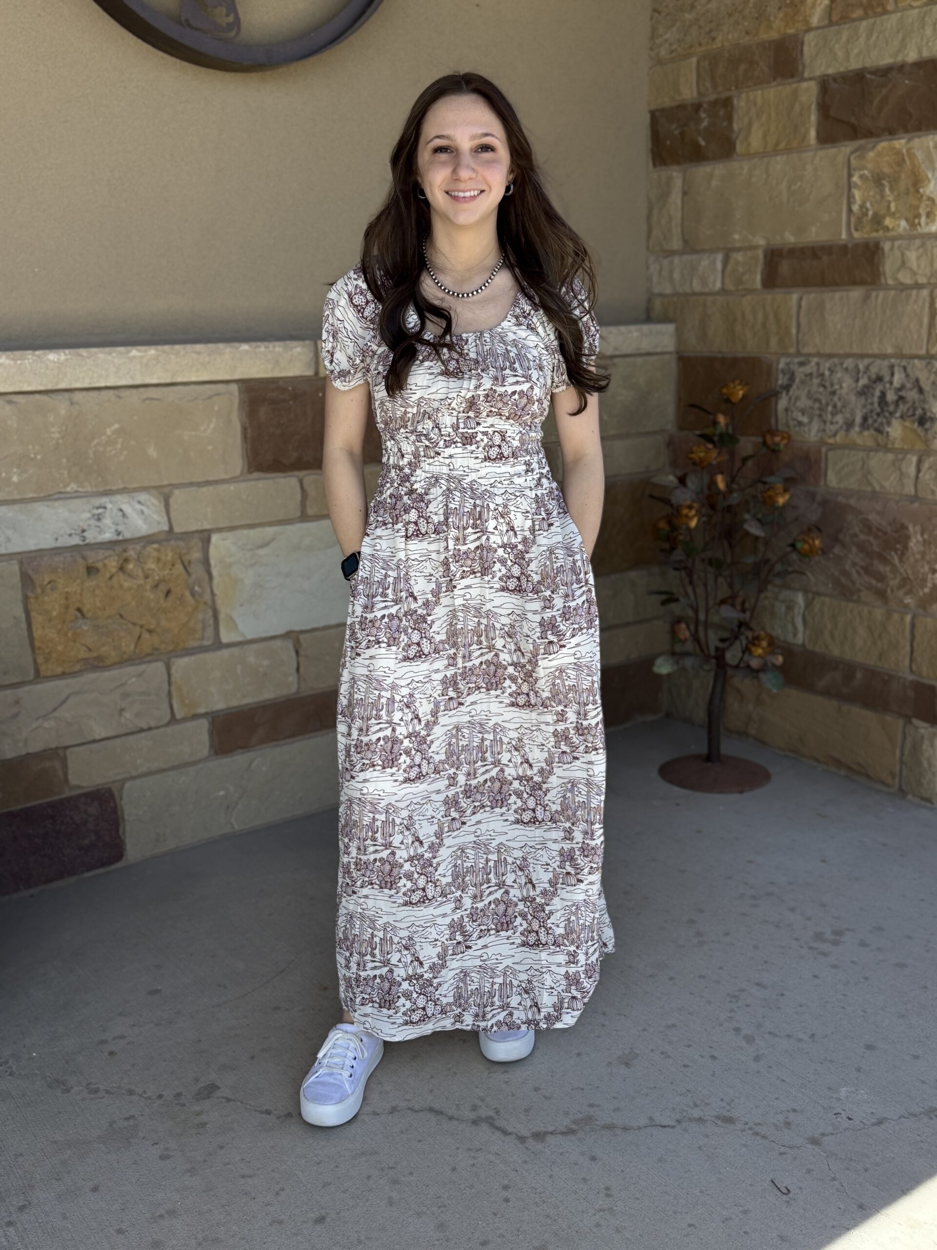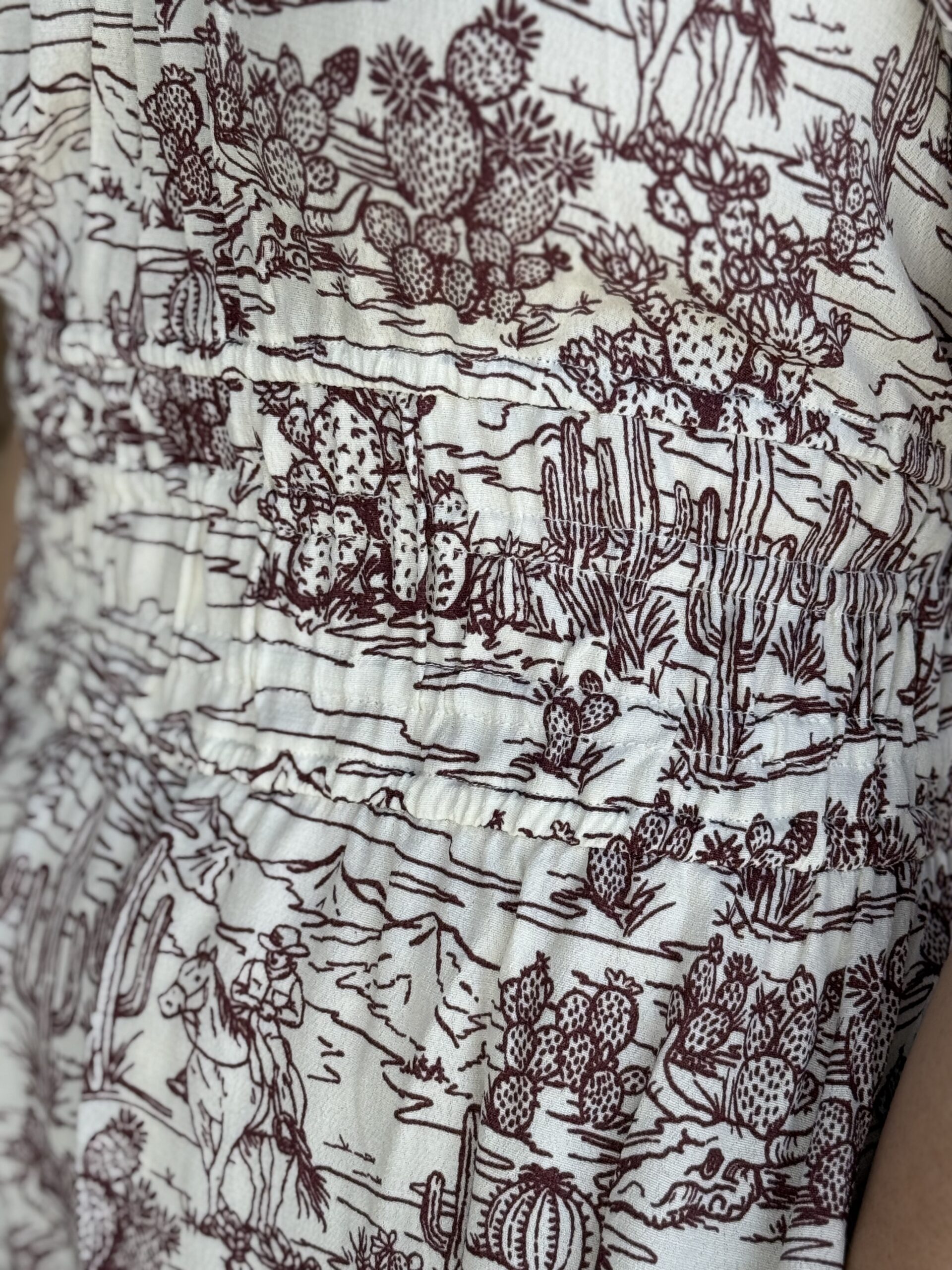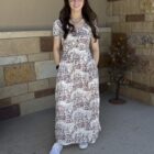 Longer dresses are made for summer too! Warmer weather is here and we are digging out the dresses. Perfect for summer, a lighter weigh material that is super comfortable to wear. A beautiful swooping neckline carries this beauty nearly all the way to the ground. A pretty subtle cream base displays western scenes all over in a pretty deep maroon. A ruched waistline separates the cute top from a flowing bottom. That neckline fades out over to the middle of the shoulder. The capped shoulder is designed with an elastic opening on the arm for a secure fit. It’s fully lined for a comfortable wear and sleek style and pockets! Yes we said it, it has pockets! Grab this one for a night out to dinner! It’s a beautiful western print on a modern cut leaving your shoe choices endless!
