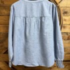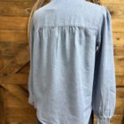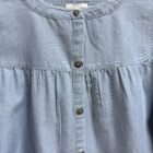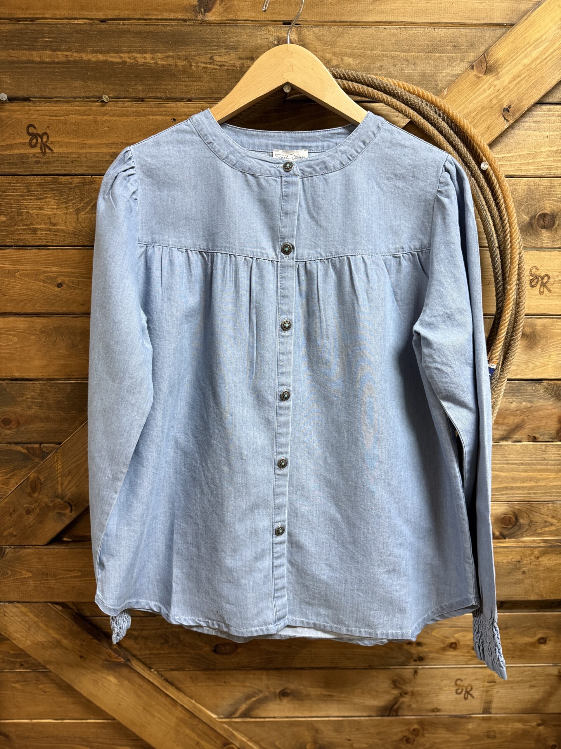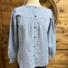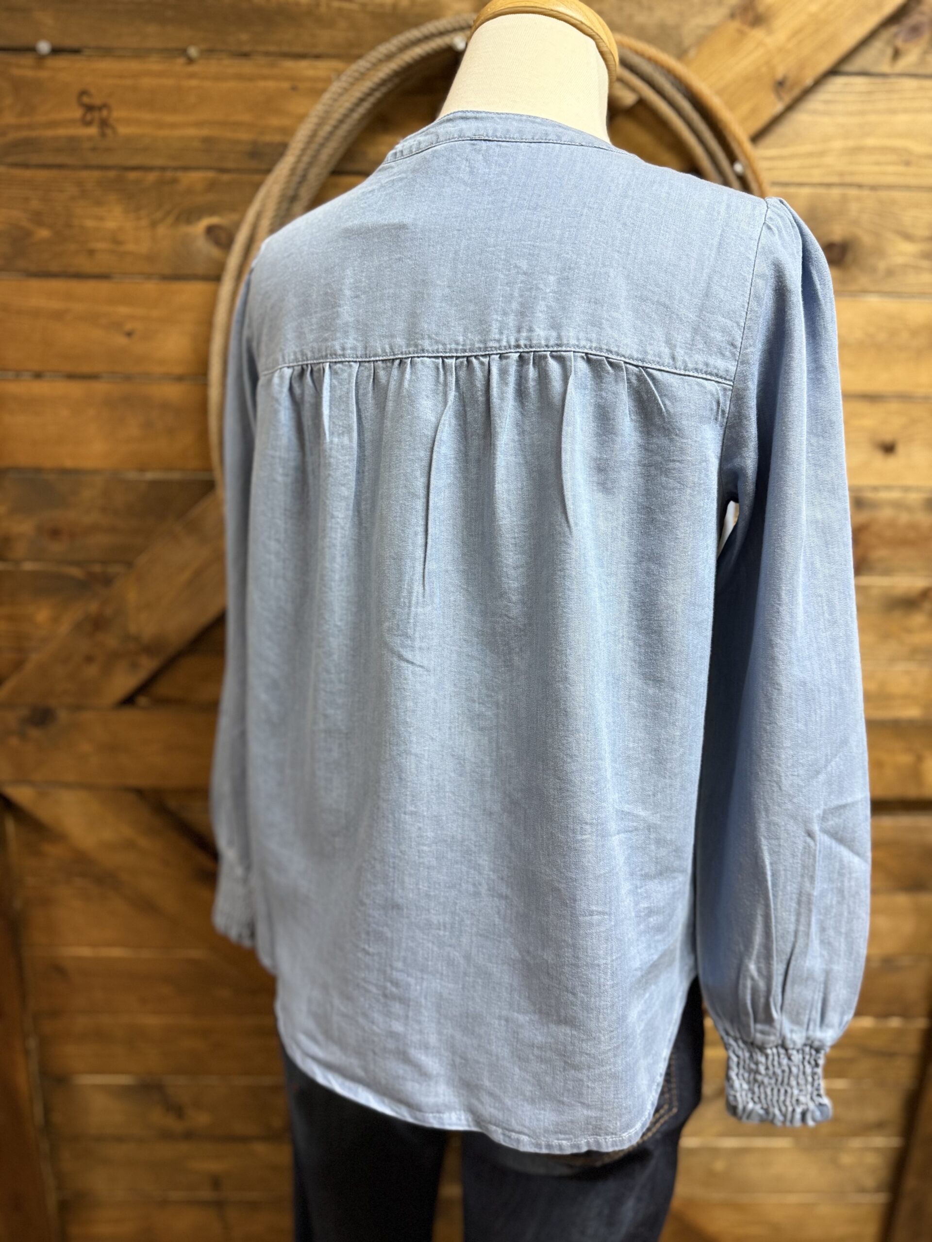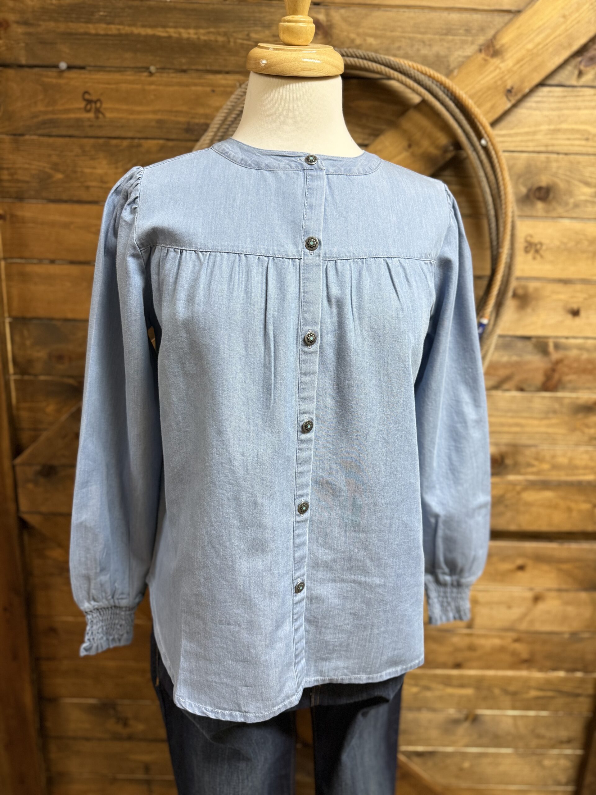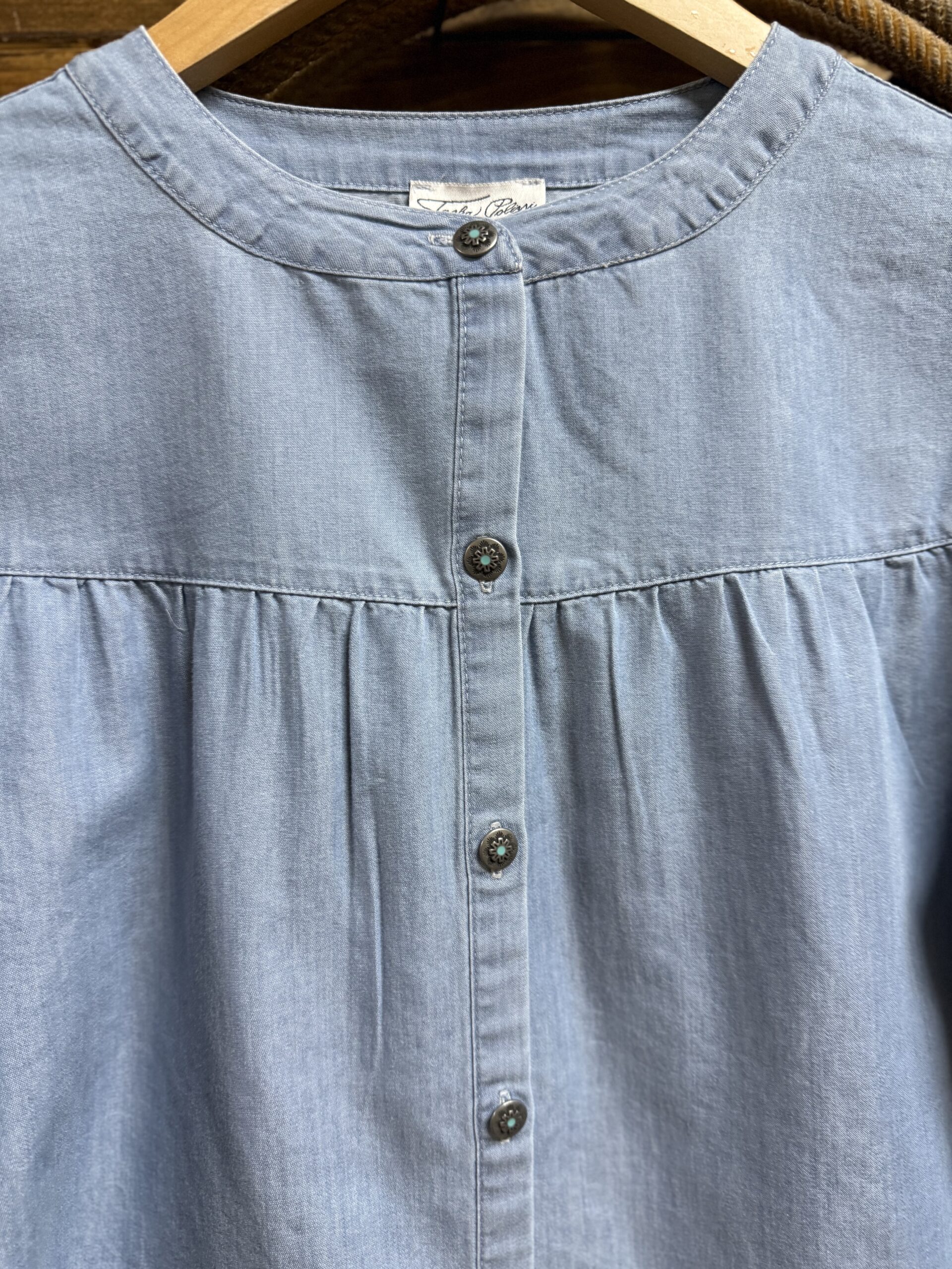 Who doesn’t love a good tencel denim top!? We do! Such a universal piece that carries many different styling options. Beautiful bright denim blue with turquoise filled center silver buttons. They are lining the front from the collar down. Pretty rounded neck line with a wide banded flat collar. This leaves your options wide open for pairing your favorite jewelry. Out on the top of the shoulder is an elegant pulled shoulder top that creates a wider sleeve that comes down to the cutest stitched cuff. Across the chest and below the neckline is a gentle hem line with a pull all the way across creating a pleated look up high. The same hem line is found on the back from shoulder to shoulder. The style opportunities are endless with this top. A wide open slate awaits your style of choice on a timeless top!