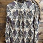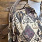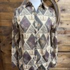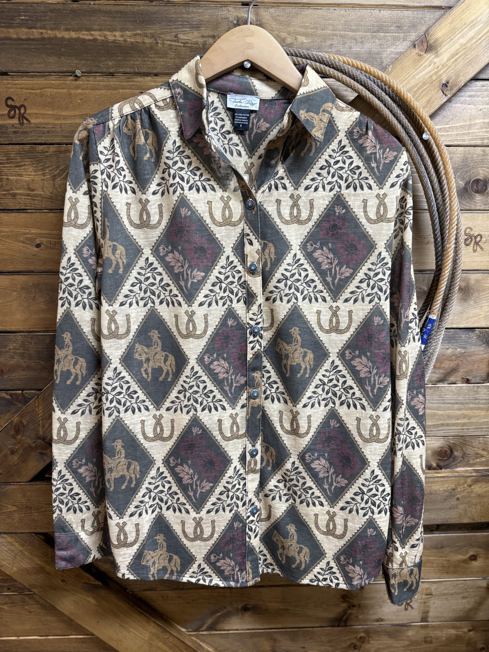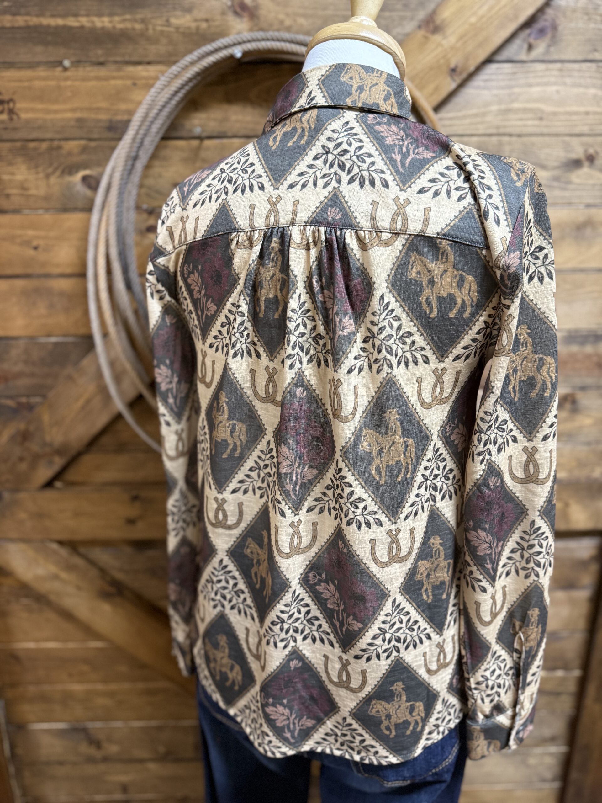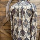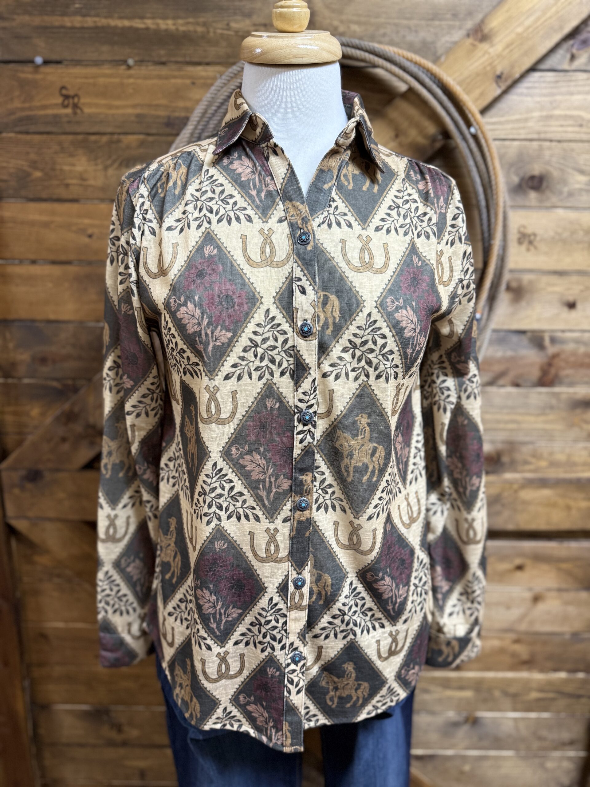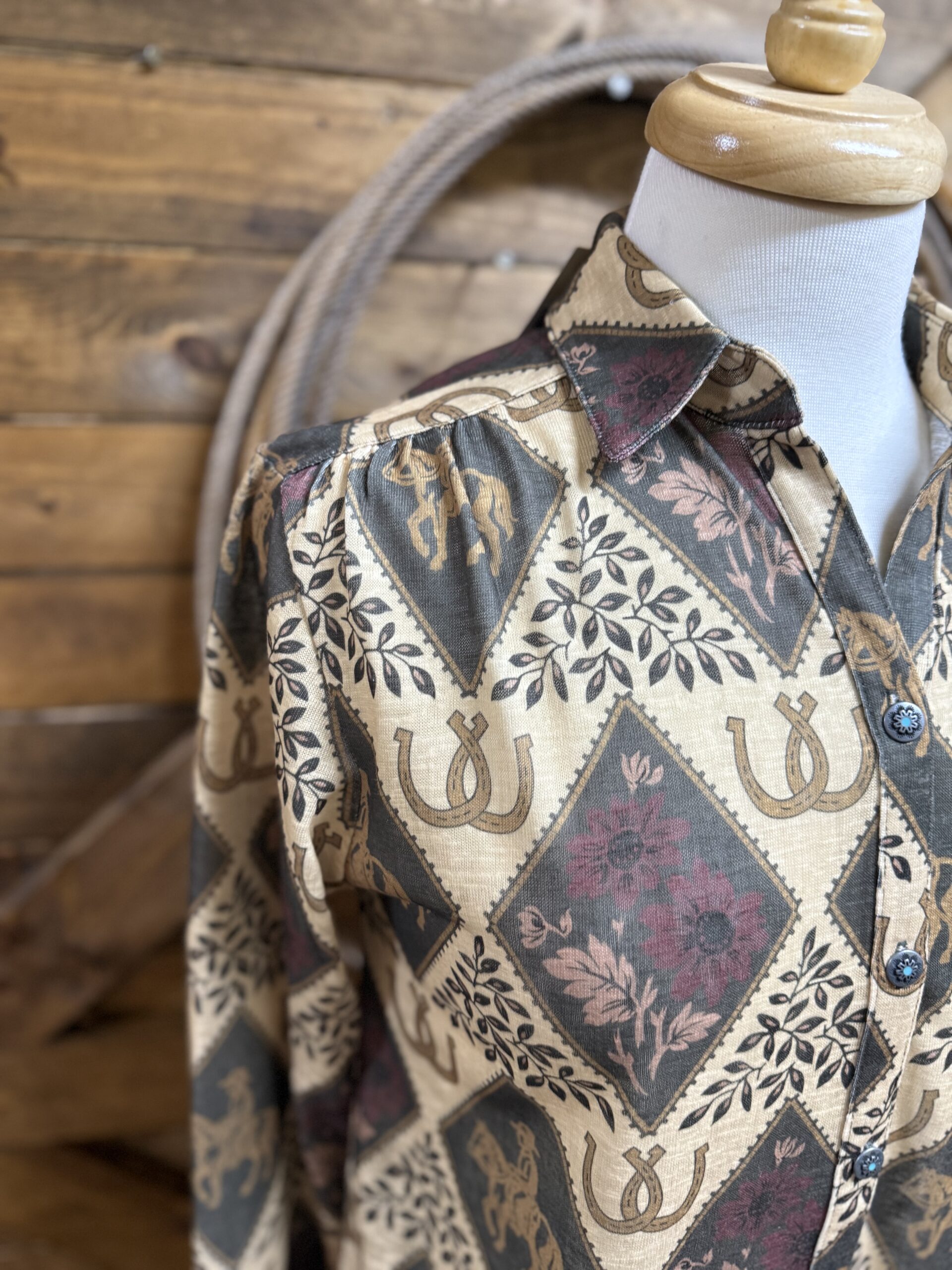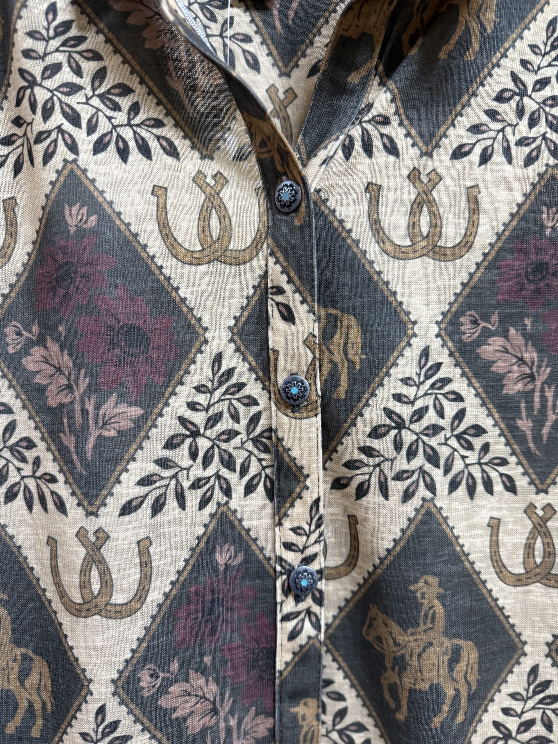 Bonnie comes to us so well styled! A gorgeous Worthington print is neatly situated to cover the blouse in its entirety. A soft long sleeve blouse that buttons down the front. Pretty little silver buttons feature a turquoise center, are at each of the sleeve ends and down the front. The perfectly ruched shoulder top creates a gentle pull in the material on the front of the shoulder leaving an elegant look. Across the center of the back is a drawn hem leaving the fit down the back a little loser and comfortable without forgoing any style. Gorgeous color patterns of off white and olive green mixed with the dull pink tones simply add to the look and style created in this top. It’s elegantly western in many style patterns.