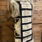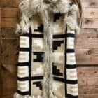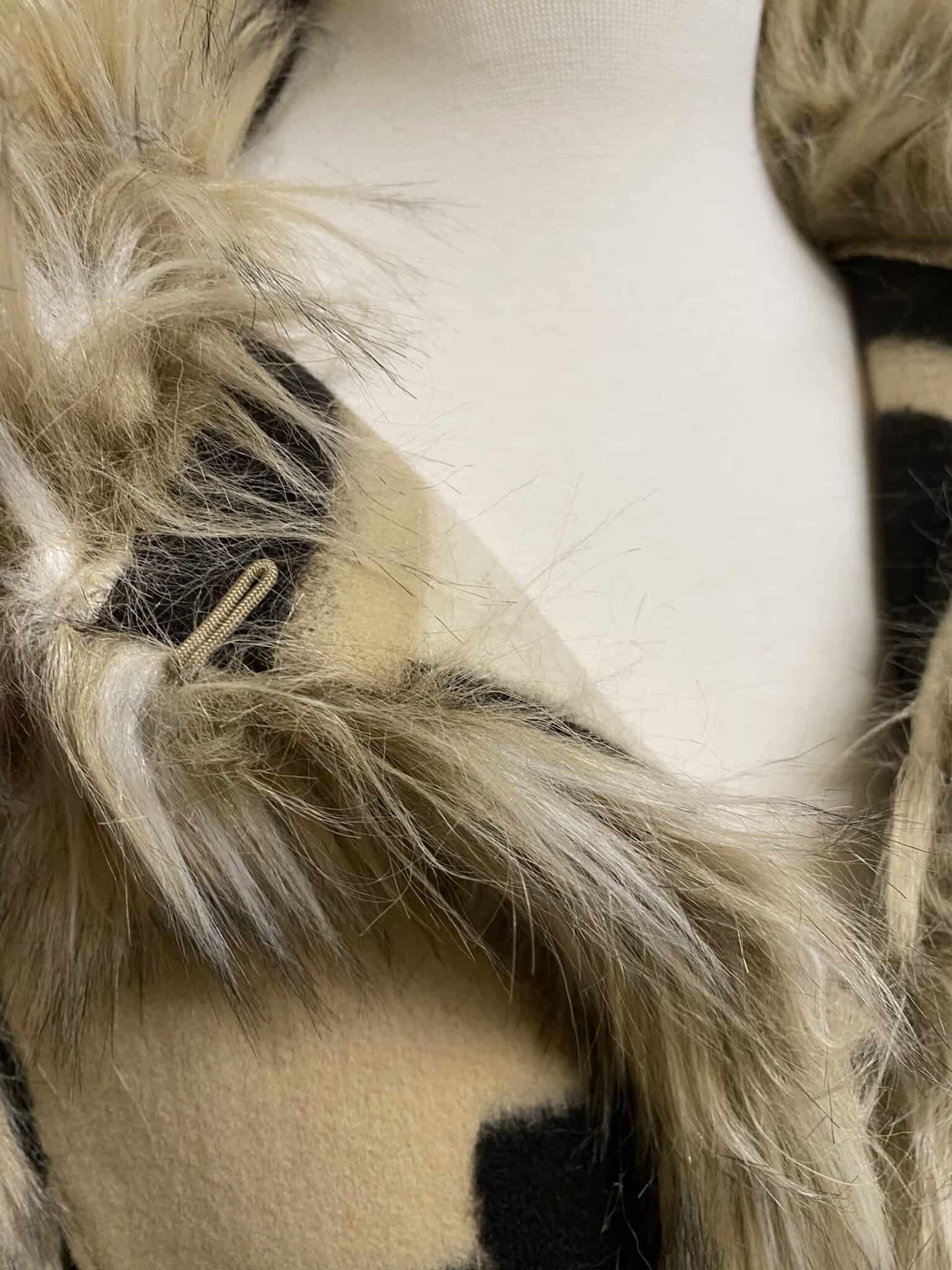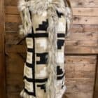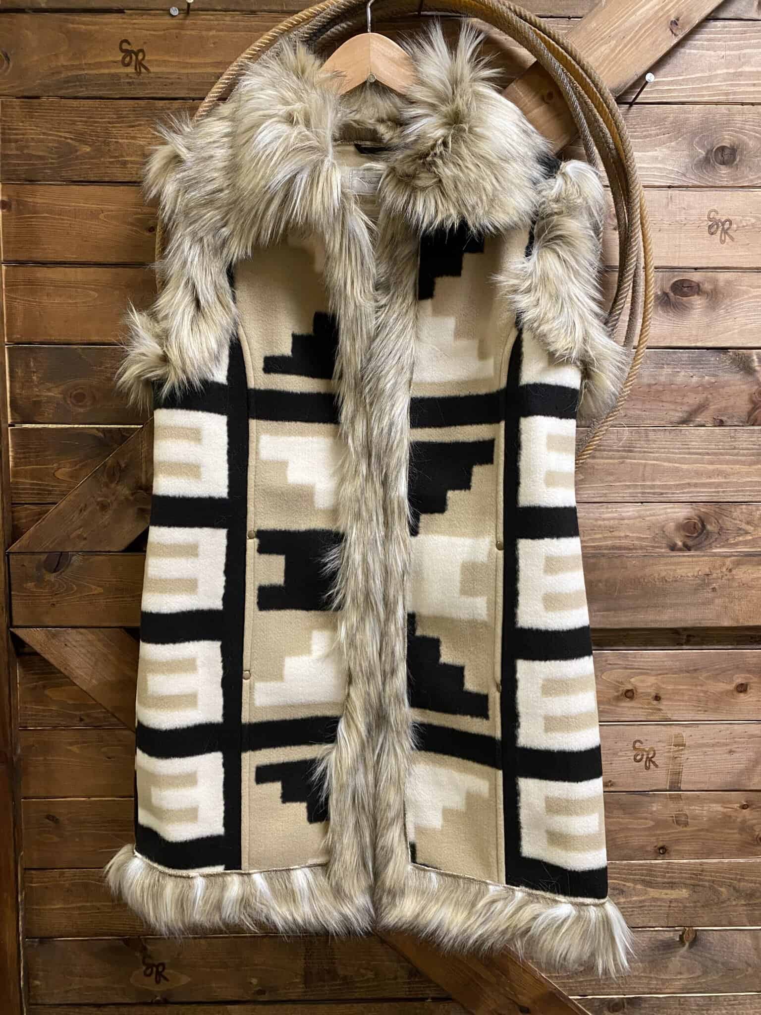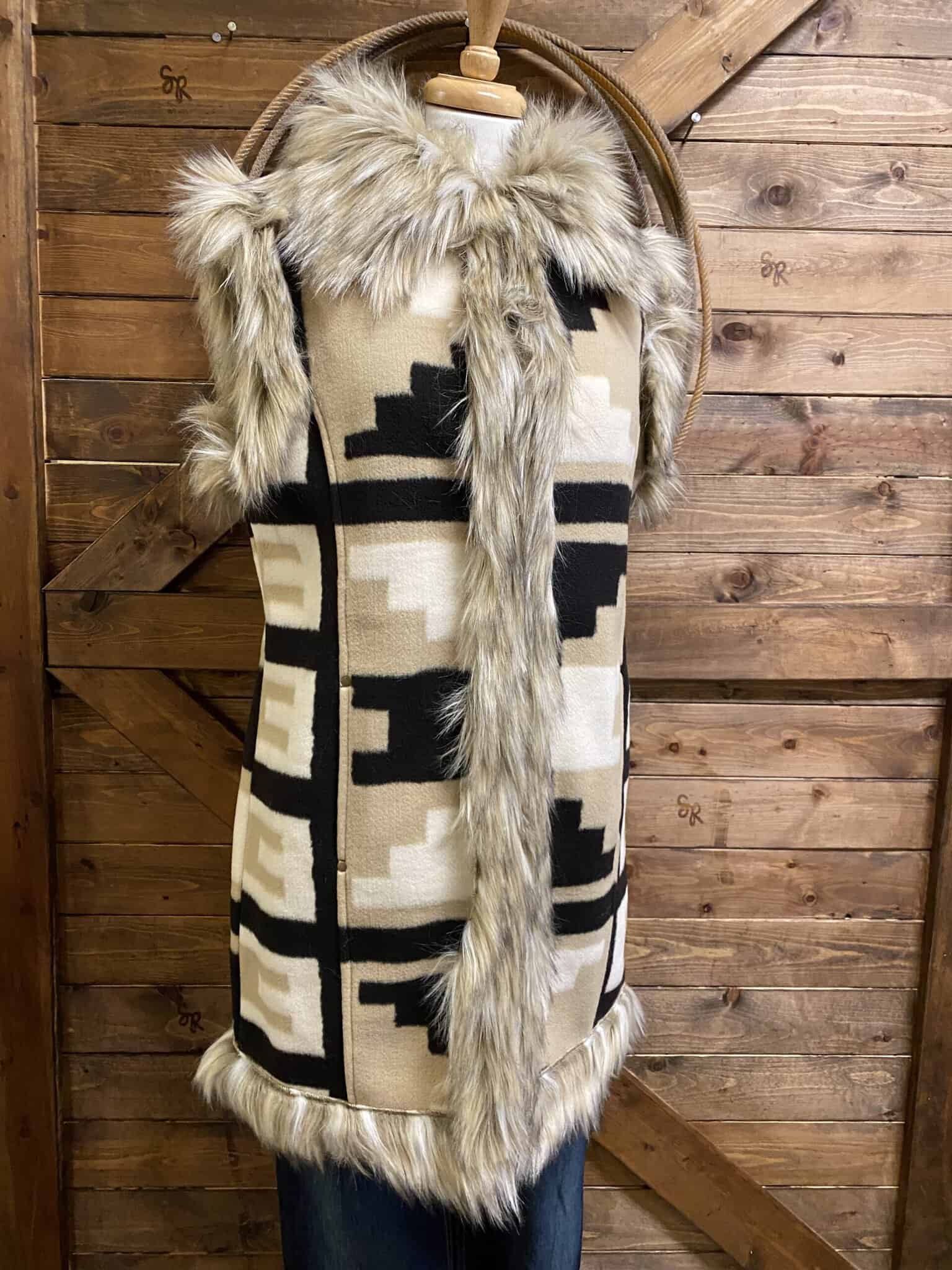 Simply beautiful! This isn’t your ordinary vest! Designed by Tasha and made with the cascade liberty blanket material, this piece is one of a kind! A vest near floor length, fur lining the front closure from the neck to the bottom hem, and around the sleeves, has us dreaming of all the ways to wear and style this unique piece! Closes down the front on hook clasps covered by the fur for a flawless look.  Neutral colors exhibit both elegance and style. A statement piece on so many levels!