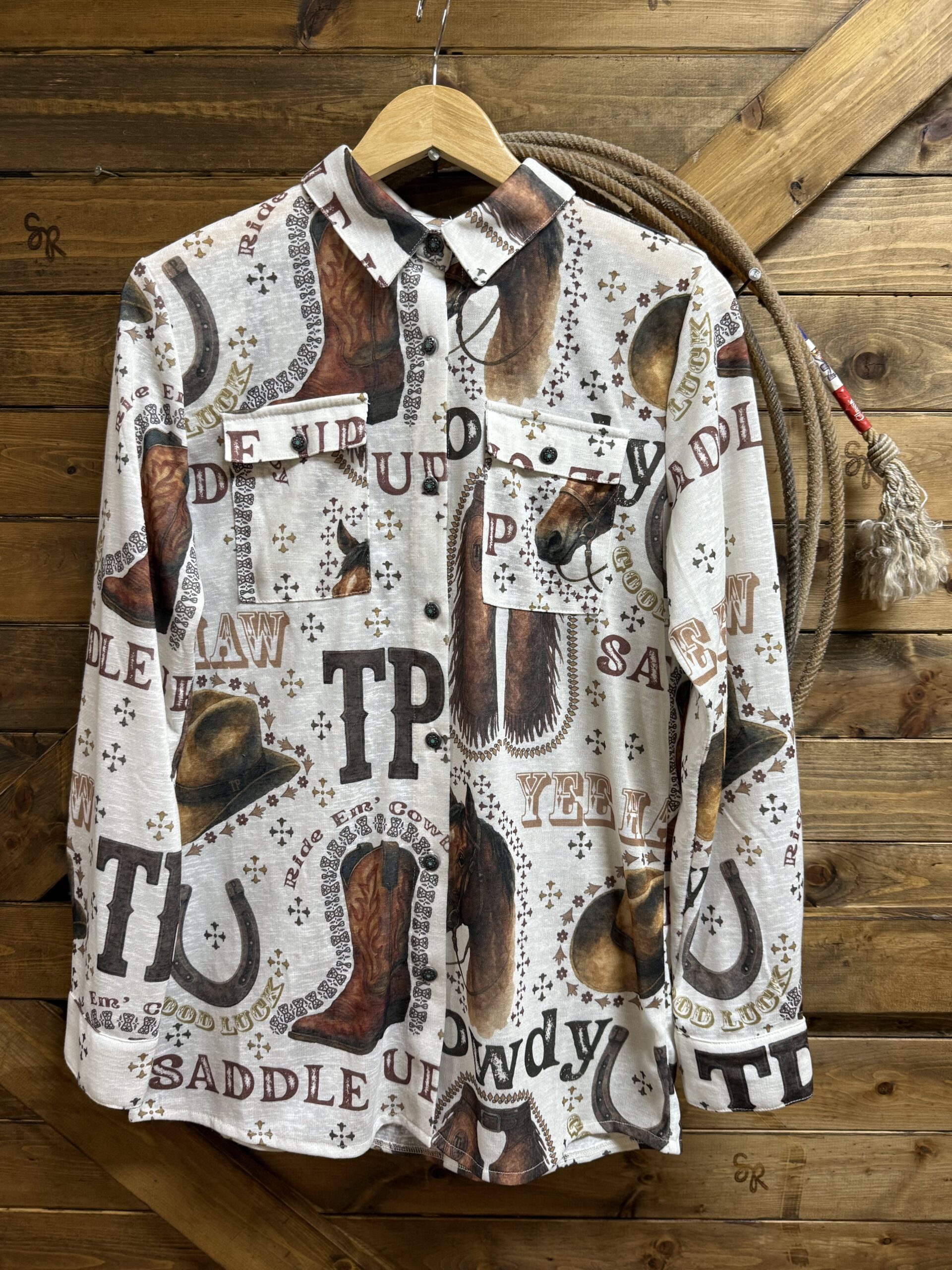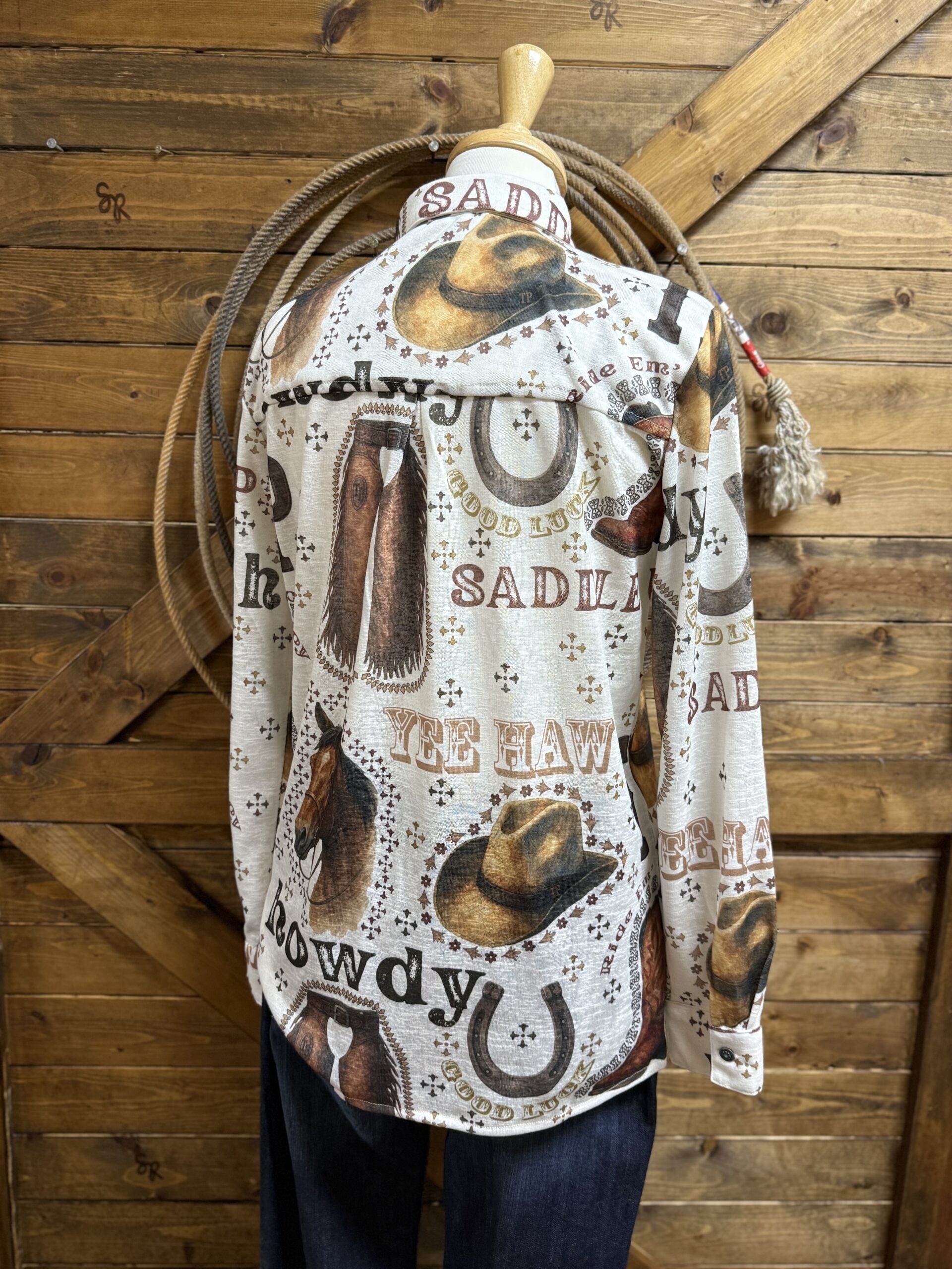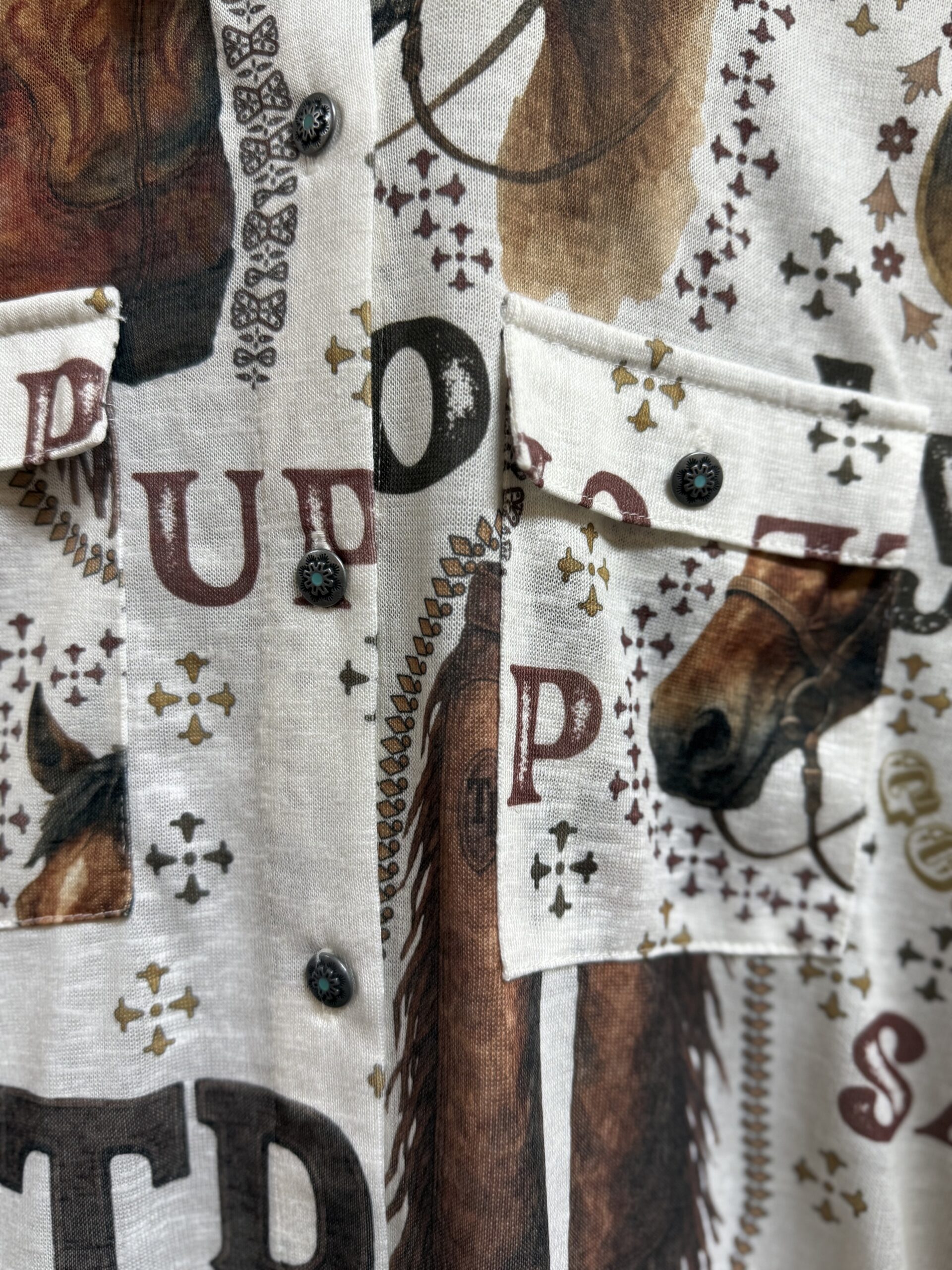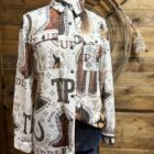 Stunning! In every sense of the word, the Mariah top is just that! Gorgeous color combinations of brown tones featured on a white long sleeve blouse. Details scattered throughout the makeup define the elegance and western style. Featured on the front, are the as always, beautiful turquoise centered silver buttons. Elegantly designed with a western punch. Each side of the chest displays a flap pocket with the single silver button as mentioned. On the backside you will notice a simple pull centered in the middle of the shoulders. It creates a loose styled fit. Up your western fashion game, and add this Tasha piece to your closet! Its timeless style is universal in looks and western fashion design.