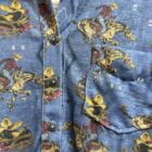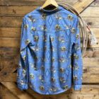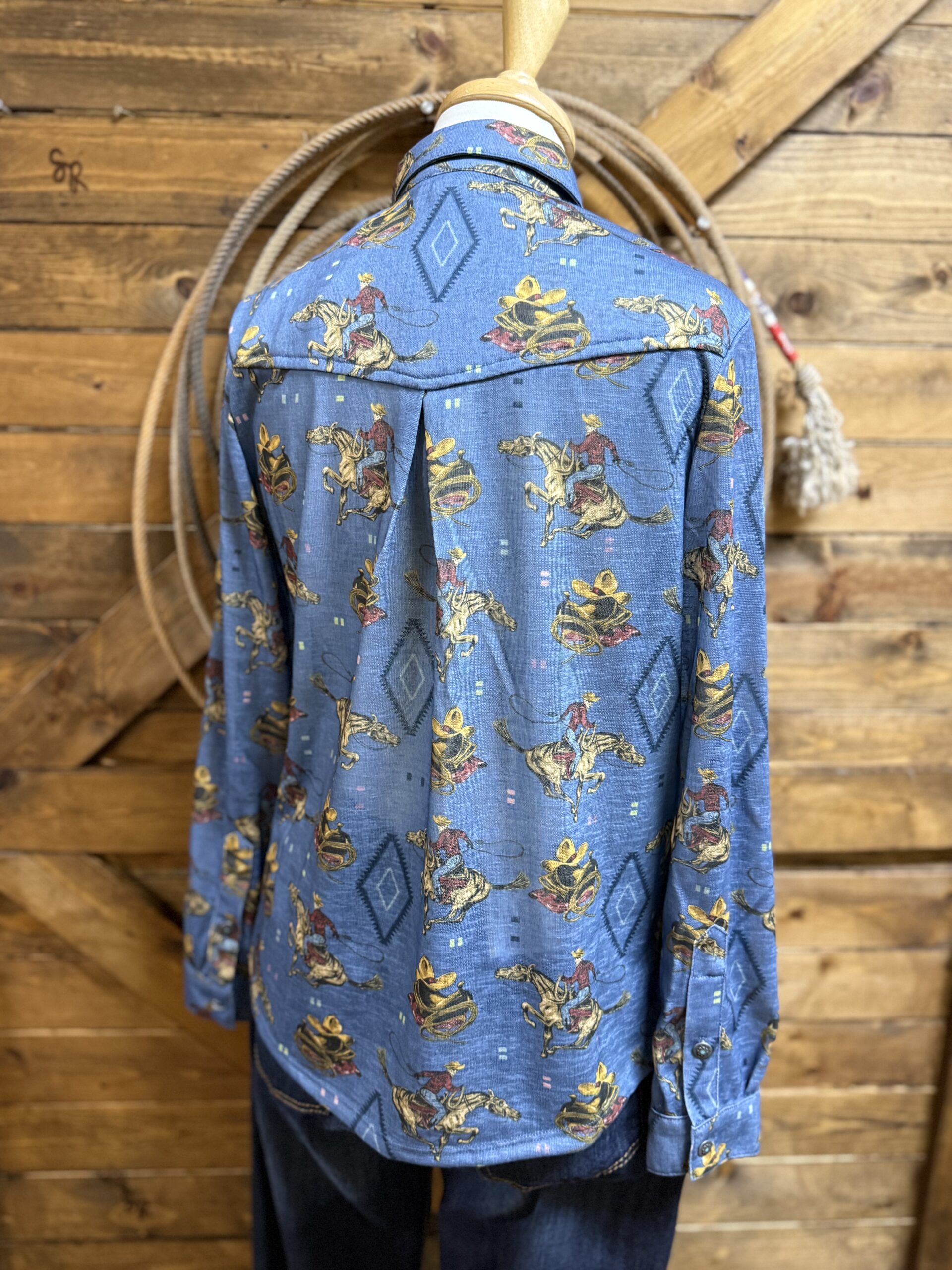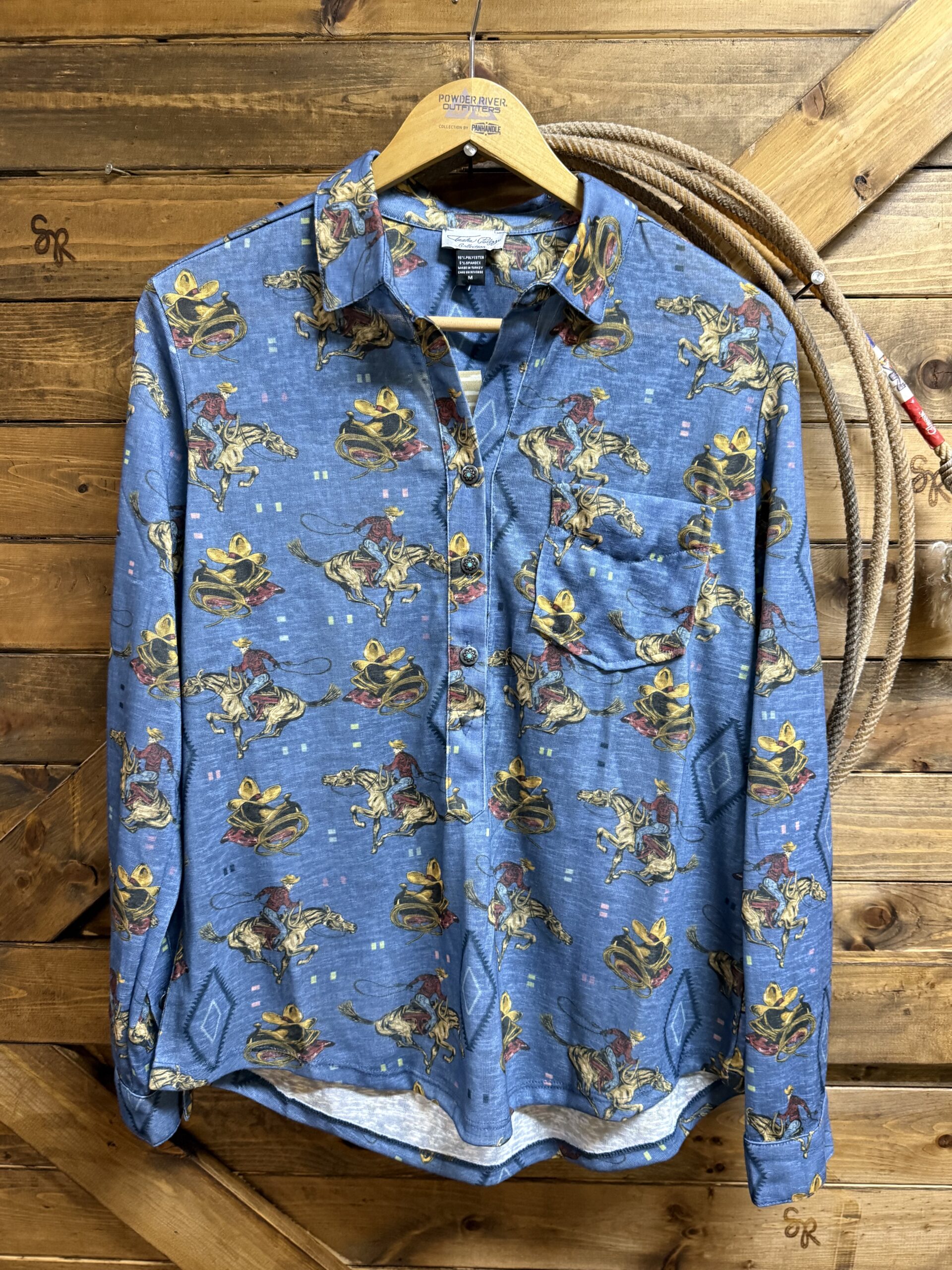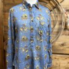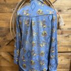 A style that never fades! Tasha Polizzi pieces are a style of their own that are beyond trends. Created with an elegant western style, the looks are timeless. Beautiful indigo riding print on a comfortable long sleeve button down blouse. The same design covers both the front and back. Features that are specific to the brand, are the pretty little detailed silver buttons highlighted with that pretty turquoise center. They line the front and close the cuffs on a single button. An open front pocket is made to set to the left side of the chest. The backside has a pull centered between the shoulders that creates a pleated look and a loose fit. A piece that is just as pretty worn alone as it is layered and dressed up for a special occasion! The look and style within this line never fade! Western fashion at its finest!