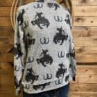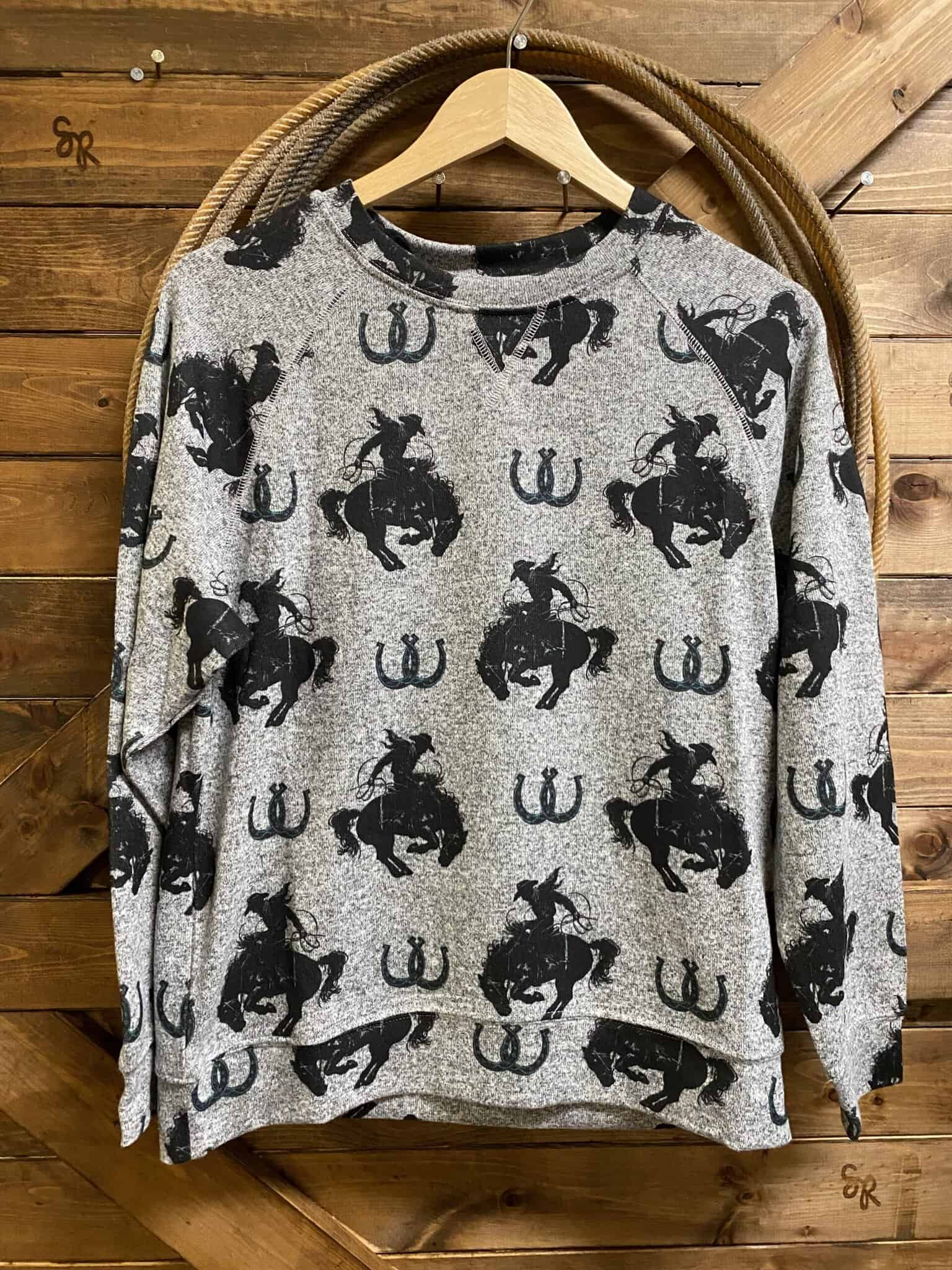 The fanciest pullover we have ever seen! We love the Rory pullover and all it has to offer! The black Jules print is an exceptional representation of a bronc rider! Detailed in all aspects the print is on a light weight heathered material with trimmings on the prints in a beautiful deep turquoise. Banded sleeves keep your sleeve in place and the waistline in place. High quality pullover, high quality print and material!
