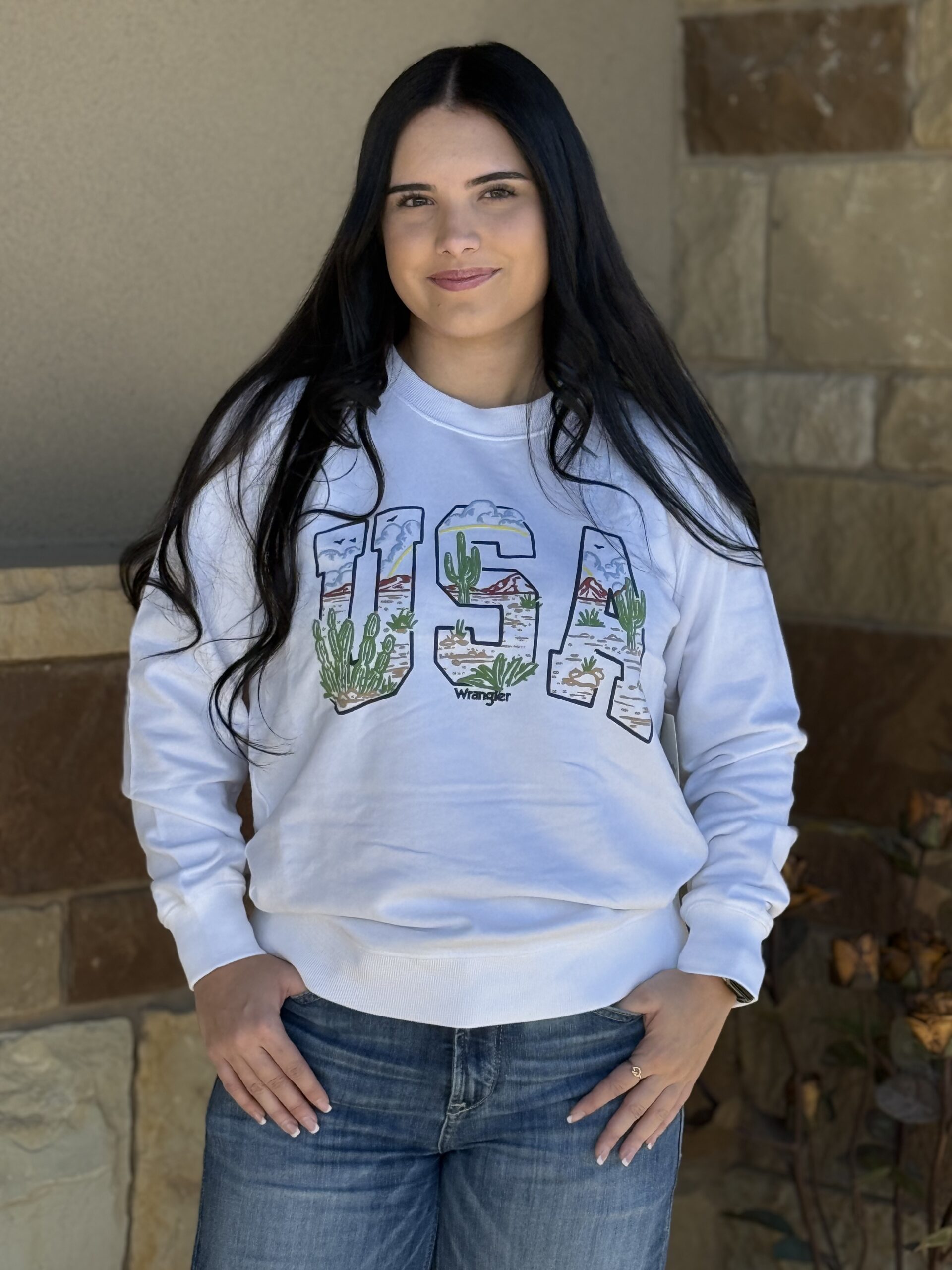 Crew necks are an easy wear piece! They are so universal in styling and so comfy at the same time. Great plain white crew neck sweatshirt cut to hit right at the waistline. USA is centered across the front in a slightly raised puff like graphic. The inside of the letters are a western desert sunset across the 3 letters. Great colors combination of blues, green, red, and tan with the pretty yellow serving as the sun. Pair this with your favorite distressed denim and a denim undershirt with a collar for a dressed up comfy look! So easy to wear and style!