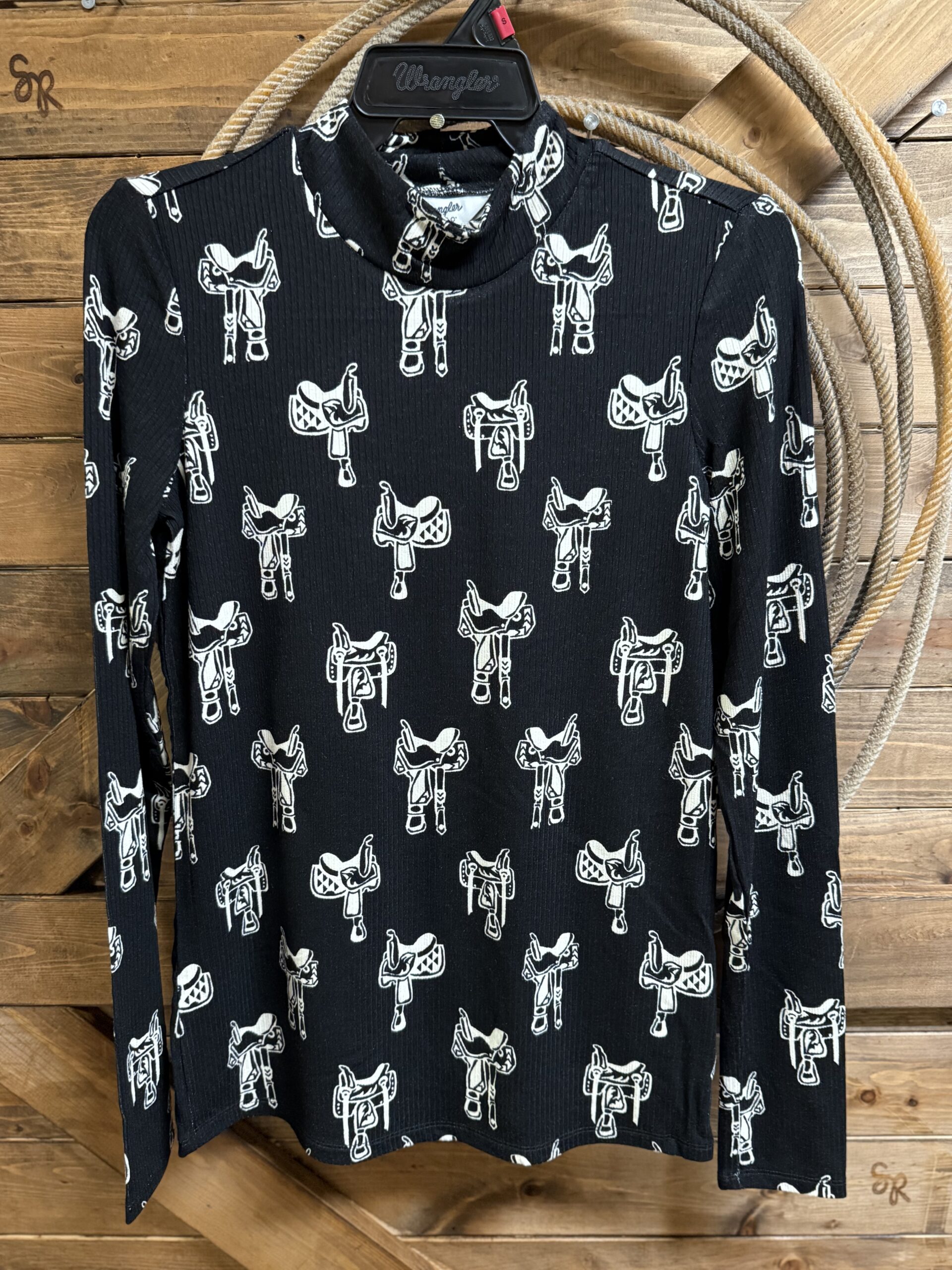 Mock neck sweaters are back!! We love the ribbed texture and the short mock turtle neck. Cute western saddles are printed in an off white on both sides. Made with a material that is comfortable to be in and has that little extra stretch that we all need every now and then. Pairs perfectly with your favorite denim jacket but looks lovely worn alone as well!